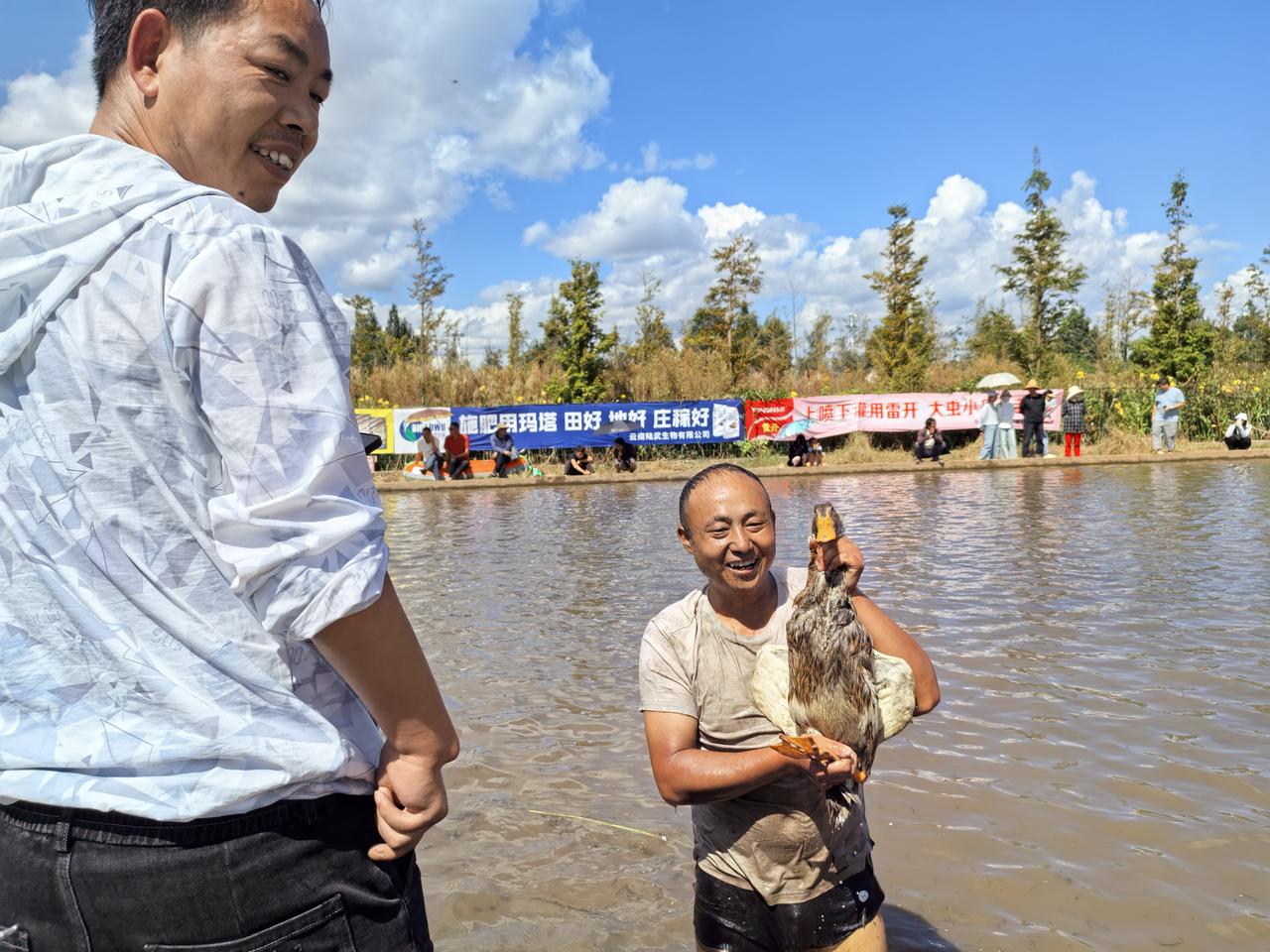 云南通海县大树社区国庆节期间举行的抓鸭大赛,大哥抓中鸭子后笑的多开心。
