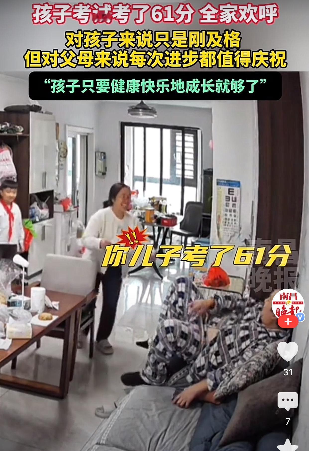 看了“孩子考试考了61分,全家欢呼”的新闻,网友家长们也替他开心! 一位家长说,我家老二也是这样长大的,因为小时候太好动了,考过29分。只要稍微一丁点进步,全家人都要互相报喜。目前这个娃,状态越来越好,一般不下90分[赞] 另一位家长则从另一面分享自己孩子:我女儿考了99,我老公一回来就批评为什么不考一百分?我说小孩子有这个成绩我们要多鼓励,然后老公跟我吵说他跟小孩子开玩笑的。可是小孩子哪里懂得,她只知道考了99还全班第一,回来还要挨批,不高兴了,我安慰了她好久。有时候跟过日子真的不一样。 还有一位家长说:我跟很多家长不一样,我不奢望小孩子读书读多好,有人第一总有人最后,我还是认为健康成长才是最重要的,现在的学习太压抑了,也太卷了,小孩子不快乐,身心不健康才是最可怕的。我都只要求孩子品行要做好,从来没有因为她成绩骂过她,不过她大多数情况也很自觉,这样子就可以了。 这些家长的故事,映照出教育观念的多元图景。有人以进步为喜,用鼓励浇灌成长;有人执着满分,却忽略了孩子的失落;更有人跳出分数桎梏,将身心健康置于首位。教育从无标准答案,但爱与理解永远是底色。或许真正的成功,不在于卷面上的数字,而在于孩子能否在包容的环境中,长成内心丰盈、自信向阳的人。