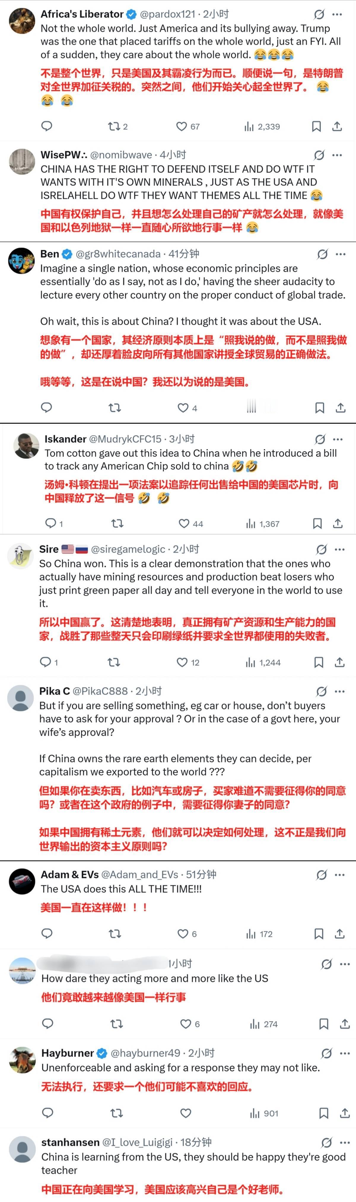 美高官恼羞成怒,痛批中国“极端”,全球网友嘲讽:这只是在学习美国 一纸公告,让华盛顿彻底炸锅。中国刚刚宣布对稀土、锂电池等关键资源实施出口管制,美国高官立马暴跳如雷,连“极端”这种词都搬了出来。但让人意外的是,全球网友却不买账,反倒一边倒地嘲讽美国:你们不是一直这么干的吗?现在轮到别人了,怎么就受不了? 10月9日,中国商务部连发六份公告,并发布一份制裁清单。 措施明确、依据充分,涉及稀土、锂电池、人造石墨负极等关键材料,覆盖从原料到设备到技术的完整链条。 更重要的是,出口管制不仅针对中国境内的产品,还延伸至国外含有中国技术价值占比超过0.1%的产品。这一招,直接打到了美国产业链的命门。 美国总统特朗普的反应堪称“典型”:愤怒、指责、反击,三连击。 他不仅在社交媒体上多次发文,斥责中国“威胁全球经济”,还宣布将对所有中国输美商品加征100%关税。 这意味着中国商品加税后总税率将超过130%。 与此同时,美方还对人工智能与航空制造软件实施出口管制,摆出一副“针锋相对”的架势。 但问题来了,特朗普嘴上说得凶,自己政府内部却并不统一。 10月10日,美国贸易代表格里尔在接受采访时称中国的做法“极端”,但又补了一句“没必要对华打贸易战”。 前一秒高喊对抗,后一秒又怕伤自己,这场景,看着像极了“左右互搏”的喜剧表演。 白宫的混乱远不止于此。 10月11日至12日,特朗普连续发声,称“难以置信”“不能容忍”,白宫高层紧急召开会议,甚至有共和党议员提出限制中国航空企业在美国着陆。 这些动作为何如此密集?原因很简单:美股应声下跌,纳斯达克一日暴跌3.56%,全球市值蒸发1.65万亿美元。不是中国“极端”,是美国自己太脆弱。 稀土是什么?它是美国军工和高科技产业的“命根子”。F-35战斗机一架要用掉408公斤稀土,美国80%的稀土进口依赖中国。 如今中方明确要求“逐案审批”,还规定即使是外国使用了中国产技术的产品也得有中国许可,这意味着美国连“绕道”都难了。 眼下,美方再想“自己动手丰衣足食”基本是不可能的。重建本土稀土产业链不仅需要15年,还要投入超过300亿美元。 更尴尬的是,美国曾经的稀土加工厂因为污染问题被重罚1900万美元,民众强烈反对再次恢复相关项目。 这就是美国的软肋,明明知道问题,却无能为力。 而中国的做法呢?并不是“突如其来”,更不是“极端”。早在2023年,《出口管制法》就已通过,法律依据完备。 2025年上半年,中国已通过配额制度调整了稀土开采总量,方向早已明确。 此次只是将制度进一步完善,并在美方不断升级半导体打压后进行有针对性的反制。这种战略节奏,既不意气用事,也不仓促冒进,称得上是“非对称反制”的典范。 值得注意的是,全球网友的反应才是整个事件中最具讽刺意味的一环。 在X平台(原推特)上,热评第一的评论是:“中国只是在学习美国。” 还有人调侃:“美国抢别人资源叫‘自由市场’,别人管自己资源就‘极端’?” 更有发展中国家网友表示支持,称“霸权惯了就怕别人不听话”。 国际舆论的风向,正在悄然变化。日本、韩国紧急召开会议研究替代方案,欧盟虽口头谴责,却也开始重新审视自身的资源战略。 美国盟友对中国的“垄断”早有担忧,但这份担忧更多源于对美方政策的不确定性: 今天封锁芯片,明天加税软件,后天又可能封杀合作项目,真正的“极端”,恰恰来自华盛顿。 这一次,中国把“规则”玩到了极致。不是任性打压,而是依法依规;不是突发制裁,而是有章可循。 相比之下,美国的反应更像是被对手用自己的武器还击后一时失控。当年你可以用技术打压别人,如今别人用资源回应你,你凭什么说别人“极端”? 真正的问题,不是中国做了什么,而是美国接受不了“对等”。 它想要既控制技术,又掌握资源,还希望别人听话不反抗。这种既当裁判又当选手的姿态,早已被世界越来越多国家识破。 中国这次的行动,就是在告诉世界:你可以不喜欢规则,但你不能只让别人遵守规则。 更深层次的问题,是美国国内的现实危机。 政府停摆已进入第11天,4000名联邦雇员被解雇,若预算问题不解决,200万现役军人也将领不到工资。 特朗普政府一边喊着“国家安全”,一边却连军人工资都发不出,这种“极端”才是真正令人震惊的。 当美国用芯片封锁中国的时候,它在宣示“我说了算”;当中国用稀土锁住美国的时候,它在回应“规则要对等”。