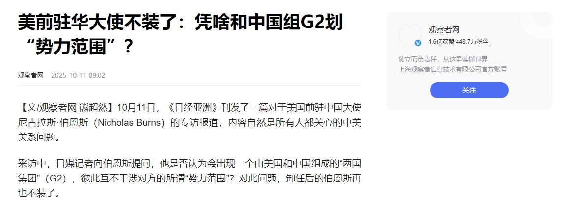 [浮云]10月11日,美国前驻华大使伯恩斯接受采访时表示,不支持所谓中国管东方,美国管西方的格局,美国不能接受中国在周边为所欲为,并强调美国自己就是太平洋国家,有权深度参与亚洲事务。 中美关系像一场拉锯战,一方推进,另一方就得调整阵脚,不是简单的谁赢谁输,而是两股力量在全球舞台上碰撞出的火花。 美国作为老牌玩家,手握金融体系的钥匙,中国则靠制造业和基础设施的韧性稳扎稳打。 数据显示,2025年上半年,中美双边贸易额依然超过6000亿美元,这不是巧合,而是两国经济脉络纠缠太深的现实。 谁要是贸然抽丝剥茧,都会伤到自己,想想看,美国企业在中国市场的布局,从芯片到消费品,撤出成本高得吓人。 中国出口链条上,美国订单占比不小,断链就等于自断臂膀,这种相互依赖,不是弱点,而是大国之间不得不面对的枷锁。 依我看,这里头最大的风险不是明面上的对抗,而是隐形的误判,实力相当的对手,往往最容易低估对方的底线。 美国一些人还停留在旧印象,以为中国会因为经济压力就让步;中国这边,也可能忽略美国在盟友体系上的杠杆效应。 2025年,台海周边演习频次增加,美国增加对台军售,中国则强化海警巡航,这不是在玩火,而是考验谁的耐心更长。 美国要是继续把亚太当成自家后院,中国自然会筑起更高墙;反过来,中国若一味强调“核心利益”,美国盟友就更铁了心抱团,结果是双输:资源浪费,信任崩盘。 当然,不能只看负面,两国在一些领域,还是有合作空间的,全球变暖不是谁家的私事,2025年极端天气频发,美国西部干旱,中国南方洪涝,两国联手研发碳捕获技术,就能分担压力。 疫情后,疫苗分发和公共卫生情报共享,也证明了务实对话的价值。 但这些合作,像脆弱的桥梁,一有风浪就晃荡,为什么?因为底层信任缺失,美国总担心中国“窃取”技术,中国则疑虑美国“遏制”发展,这循环下去,谁都累。 同时中美博弈不只是双边事,还牵动全球格局,欧洲、日本、印度,这些玩家都在观望,美国拉盟友建“印太经济框架”,中国推“一带一路”连通欧亚。 谁的模式更吸引人?不是靠喊口号,而是看实效,中国在非洲的投资,建路修桥,换来资源和市场;美国强调“民主价值”,但援助条件多,执行慢。 2025年,全球南方国家经济增长点多在中国,美国影响力却在滑坡,这是美国最大的隐忧:实力相当时,光靠硬实力不够,软实力更关键。 中国用行动证明“共赢”可行,美国若还停在“零和”思维,早晚被甩在身后。 你认为如果中美真能找到平衡点,亚太会变成什么样?是新冷战,还是新型共荣? 信息来源:观察者网 美前驻华大使不装了:凭啥和中国组G2划“势力范围”?