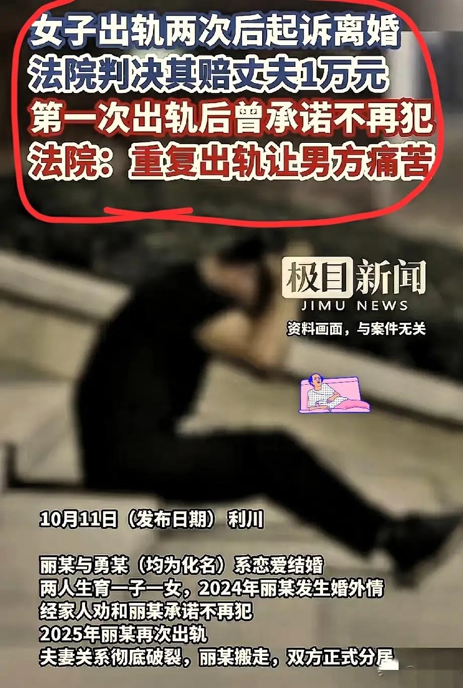 湖北这事儿看得人火大!女子婚内出轨,在家人面前哭着保证不再犯,丈夫念着俩孩子忍了,结果才一年就故态复萌,转头还先告到法院要离婚。 最气的是,法院判离后她就赔了1万块!网友骂“出轨成本太低”,这话真戳心窝子。婚姻淡了能沟通,压力大了能一起扛,可背叛从来不是“日子难”的挡箭牌,是明知底线还非要踩的自私。 1万块补得了破碎的信任吗?补不了夫妻俩多年的情分,更抹不去孩子心里的疙瘩。法律给了赔偿说法,可这点钱反倒像在说“背叛没什么大不了”。婚姻里最伤人的从不是柴米油盐的平淡,是承诺当耳旁风、底线当摆设的明知故犯。 要是连背叛都能用1万块轻飘飘收尾,那认真过日子的人,凭什么要守着底线受委屈?