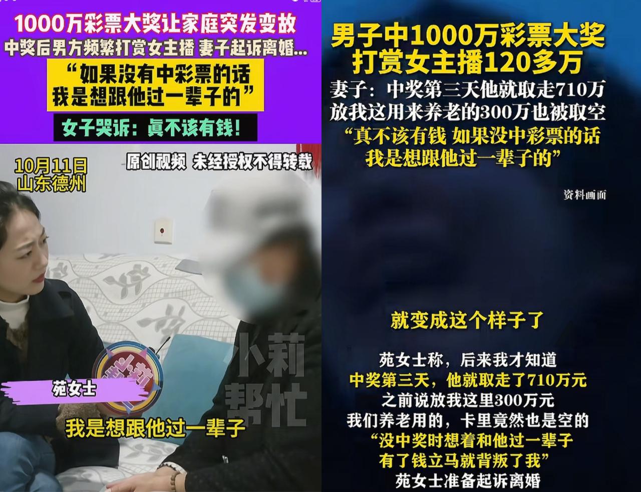 “真不该有钱啊!” 山东德州这事儿,可太让人唏嘘 男子42元彩票中1000万,扣税后到 手814万,本是好事,却成家庭破碎导火索。 有钱前,夫妻平淡但温馨 有钱后,男子飘了,打牌、打赏女主播 对妻子却一毛不拔还欺骗她。 其实,不是钱的错,是这人本性如此 一有点钱就忘本。钱像面镜子,照出他的不堪。 大家说,这是不是自食恶果? 要是你遇到这情况,会咋选?快来说说。