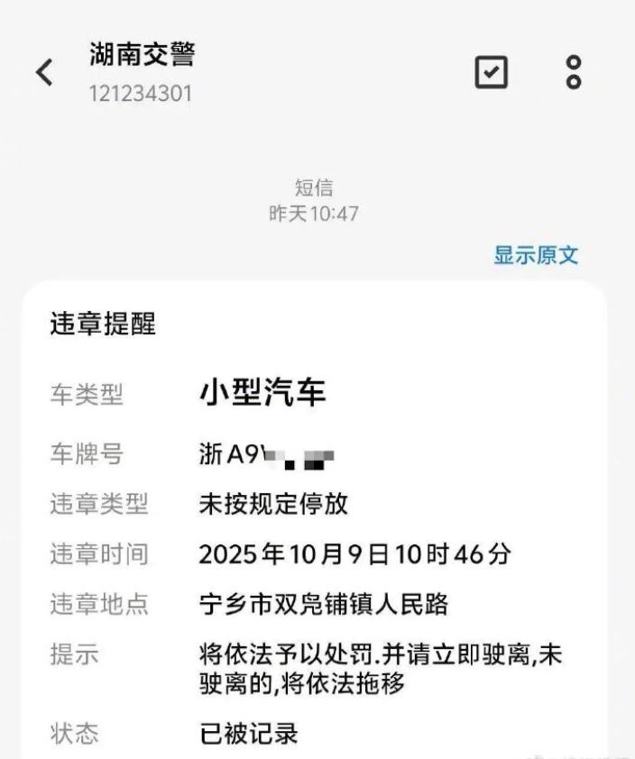 杭州的一名女士收到了一条来自湖南交管部门的短信,说她的车在宁乡市违停,让他尽快驶