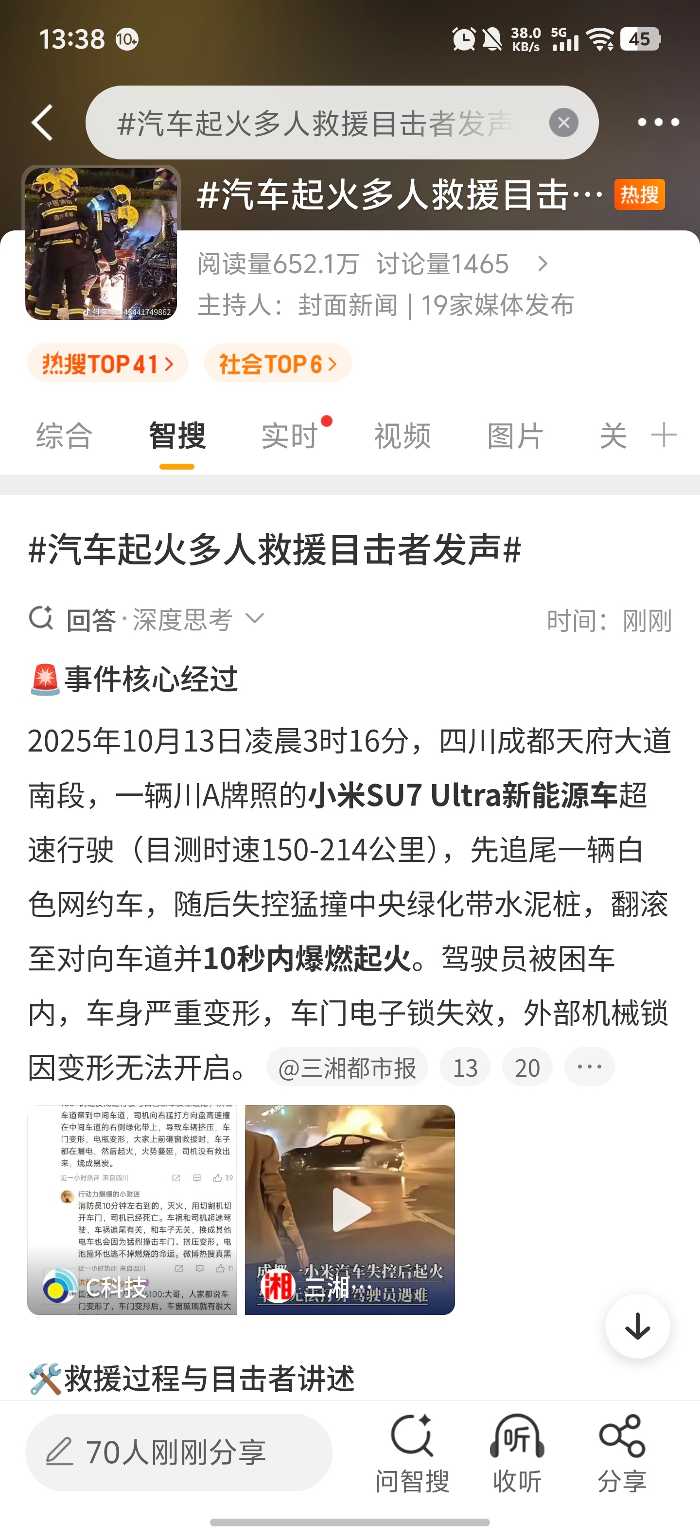 成都一车辆起火多人救援打不开门小米Su7 Ultra车主……唉,小米把性能车价格打下来本是好事,可是却让一些对速度没有概念的人拥有了上手的机会。说实话,不知道作何评价,心里五味杂陈。