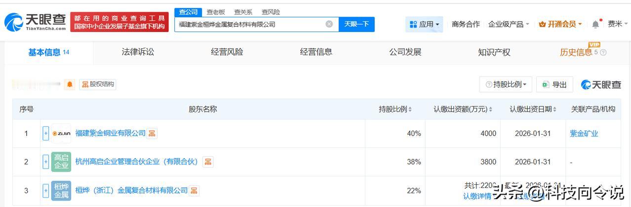 【紫金矿业等成立金属复合材料公司 注册资本1亿】 天眼查App显示,近日,福建紫金桓烨金属复合材料有限公司成立,法定代表人为周建辉,注册资本1亿人民币,经营范围包括有色金属压延加工、金属基复合材料和陶瓷基复合材料销售、新材料技术研发等,由紫金矿业(601899)旗下福建紫金铜业有限公司、杭州高启企业管理合伙企业(有限合伙)、桓烨(浙江)金属复合材料有限公司共同持股。 天眼查信息: