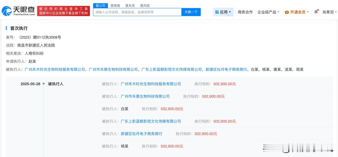 【多方侵权赵丽颖被限消 侵权赵丽颖多方成老赖】 天眼查天眼风险信息显示,近日,广州市禾慕生物科技有限公司、广东上影蓝鲸影视文化传媒有限公司、广州禾木时光生物科技服务有限公司等被列为失信被执行人(老赖),并新增限制消费令信息,涉及与赵丽颖相关人格权纠纷案件,执行法院为南昌市新建区人民法院。案件流程信息显示,今年5月,上述被告已因此案被执行50.29万元。 天眼查信息: