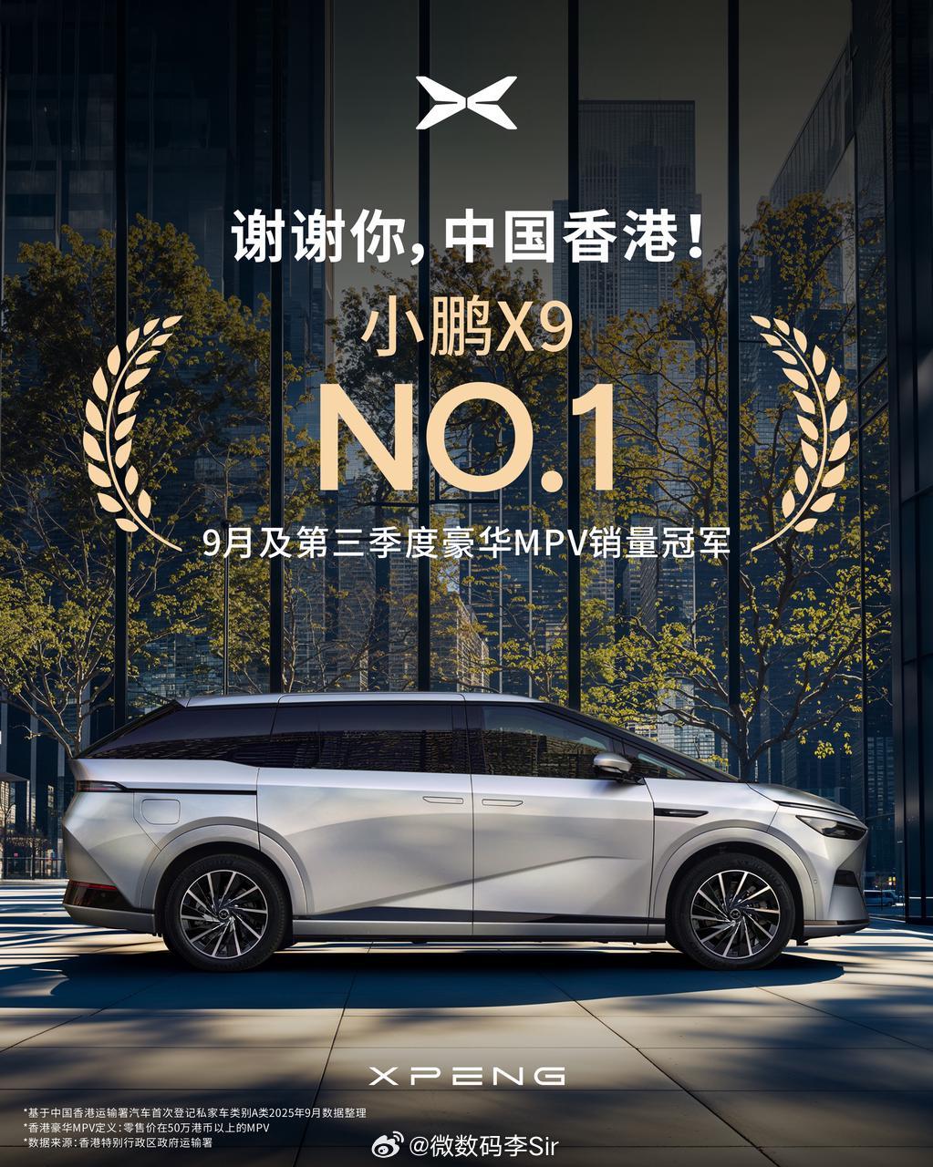小鹏X9在香港卖爆了!小鹏X9在香港又一次超越埃尔法,登顶9月豪华MPV销量榜首,并以193辆的上牌量成为香港第三季度豪华MPV上牌量第一,斩获9月及第三季度豪华MPV双料销冠!