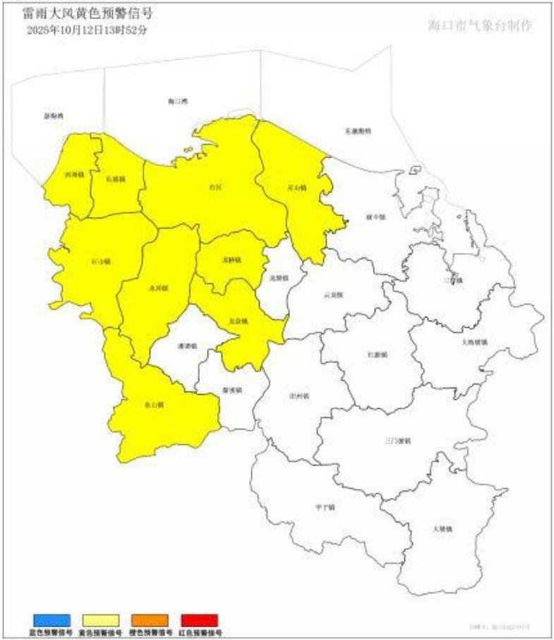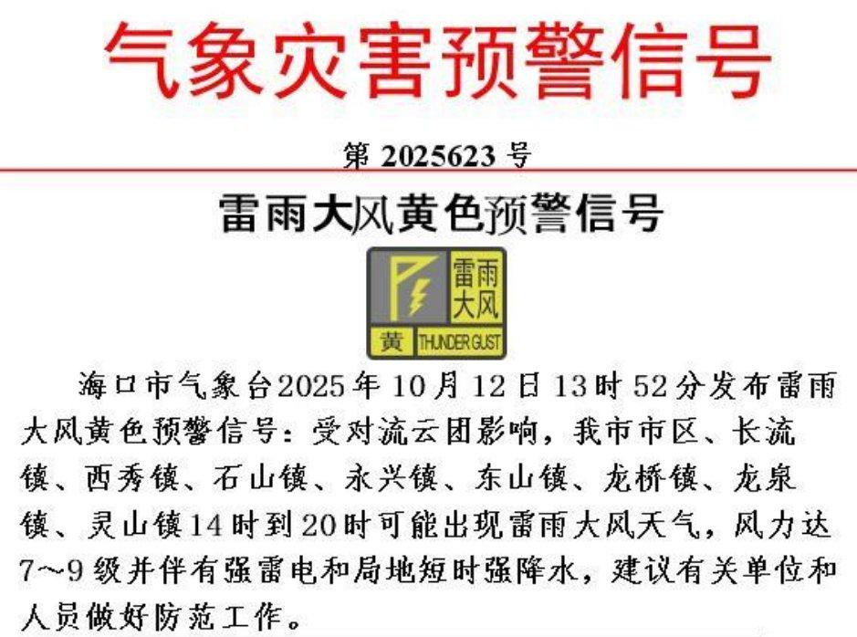 受对流云团影响,海口市市区、长流镇、西秀镇、石山镇、永兴镇、东山镇、龙桥镇、龙泉镇、灵山镇14时到20时可能出现雷雨大风天气,风力达7~9级并伴有强雷电和局地短时强降水,建议有关单位和人员做好防范工作。