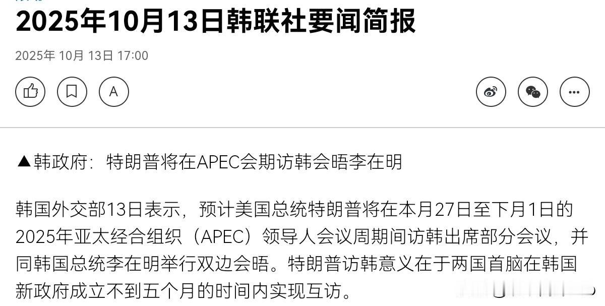 韩国外长传递出惊人消息,但中方就一关键问题没有松口!10月13日,根据韩联社报道,韩国外交部13日表示,预计美国总统特朗普将在本月27日至下月1日的2025年亚太经合组织(APEC)领导人会议周期间访韩出席部分会议,并同韩国总统李在明举行双边会晤。而与此同时,韩国外交部长赵显也发布了一个重要消息。 韩国外长赵显称,中国已经应邀出席在韩国举行的APEC峰会,韩国方面称,韩国政府将争取借机推动韩中最高层级之间的交流。很显然,韩国方面同一时间这是公布了两个非常重要消息。不出意外,中国和美国将都会出席在韩国举行的峰会。但是,事实上,尽管韩国进行了这样的发布,我们在一个关键问题还一直没有松口。 那就是,到底中美会不会有会晤,我们仍旧没有表态确认。美国方面无疑是想跟我们见一面的,但是就在日前,情况出现了新的变数。美国贸易代表格里尔表示,中国已经拒绝了美国的通话请求。很显然,由于美国没有诚信,破坏中美谈判的良好势头,中美之间的沟通已经变得不再顺畅。而现在,美国很急切,我们却不表态,这就说明美国的行为,还没有校准到让我们满意的轨道上来。而至于美国期待的会晤会不会发生,这无疑还有巨大的变数。