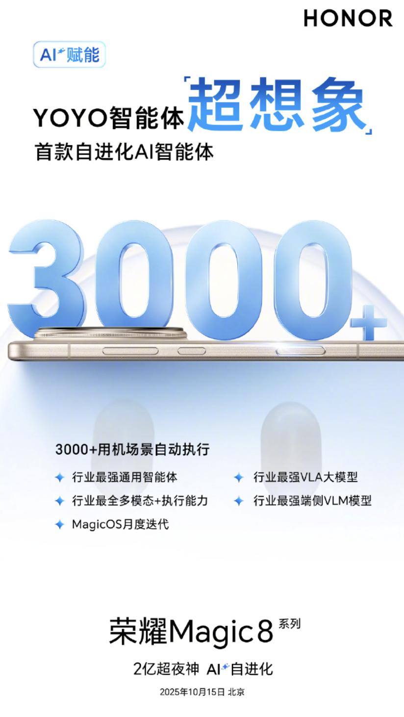 当苹果还在挤牙膏给今年才给iPhone17标准版上高刷,荣耀Magic8早已打破常规,让入门旗舰成为全能型选手,有望成为今年最强标准版。 影像一直是标准版旗舰的弱势,但荣耀Magic8体验完全颠覆。搭载5000万像素主摄、6400万像素潜望长焦和5000万像素超广角的三摄组合,支持3倍光学变焦,硬件拉满。配合AI荣耀夜神引擎以及行业最稳CIPA5.5级防抖,夜景拍摄表现大幅提升。 AI体验是Magic8系列的核心竞争力,新加入的侧边AI键可一键唤醒YOYO智能体,实现跨应用操作和智能服务。YOYO已通过中国信通院L3卓越级认证,能主动提供外卖进度跟踪、消息提炼等贴心服务。 除了影像和AI体验,荣耀Magic8在屏幕、性能、续航也有很大的升级,10月15日发布会我们共同见证!