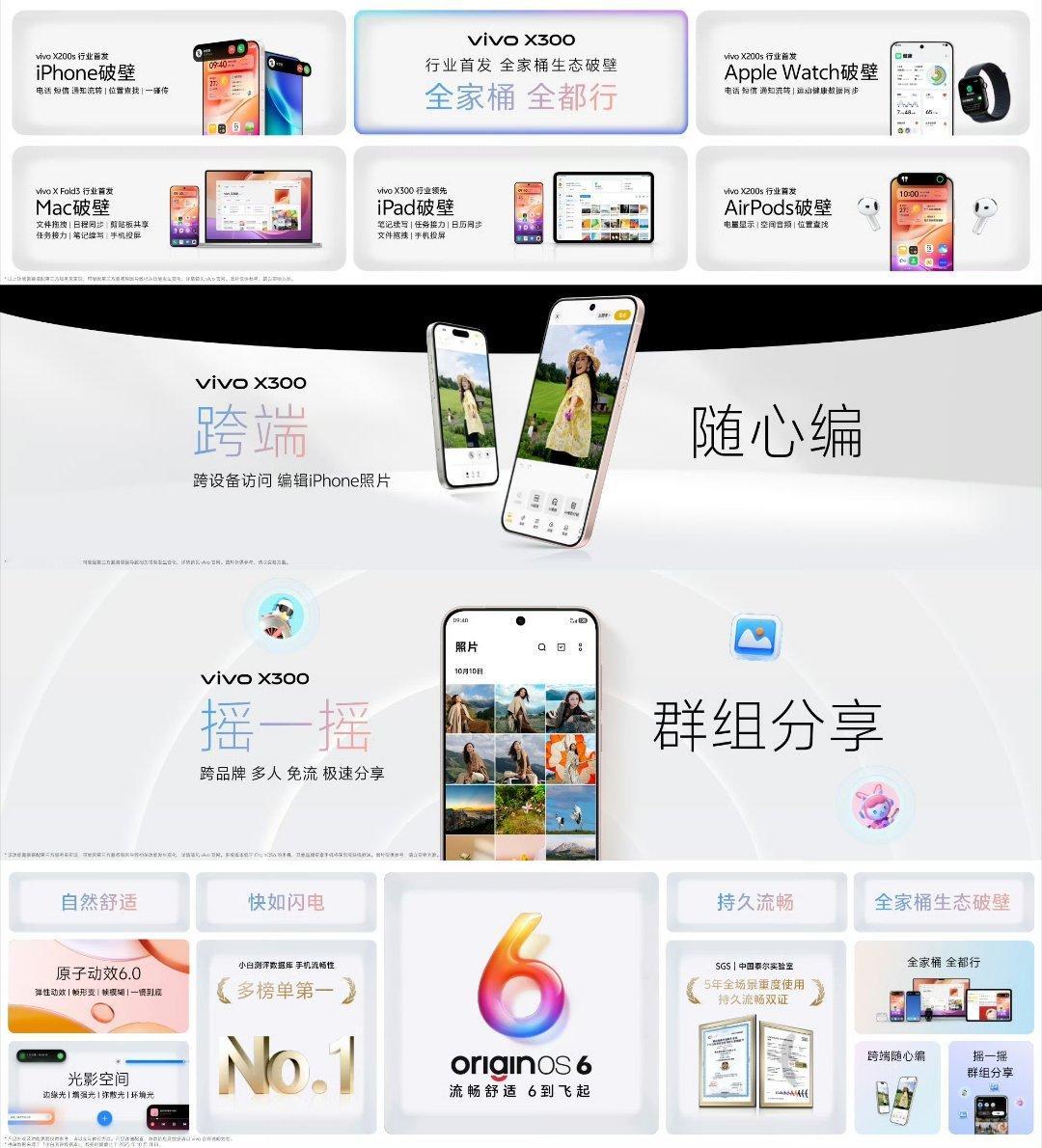 生态破壁 | 行业首次实现全家桶生态互联;X300的照片可以通过摇一摇群组分享,一键分享无损原片,不论苹果安卓。iPhone里的照片,X300可以跨端随心编。