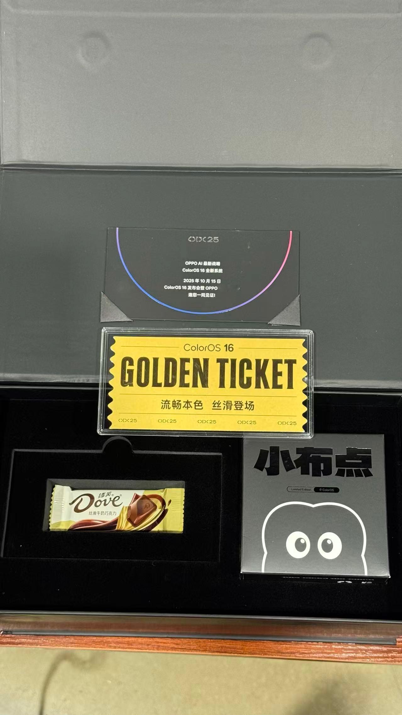 收到了OPPO发布会的邀请函,用金片做的ColorOS16流畅丝滑,还送了一个毛绒挂件和德芙巧克力,期待新机发布[doge]