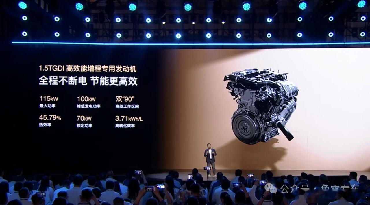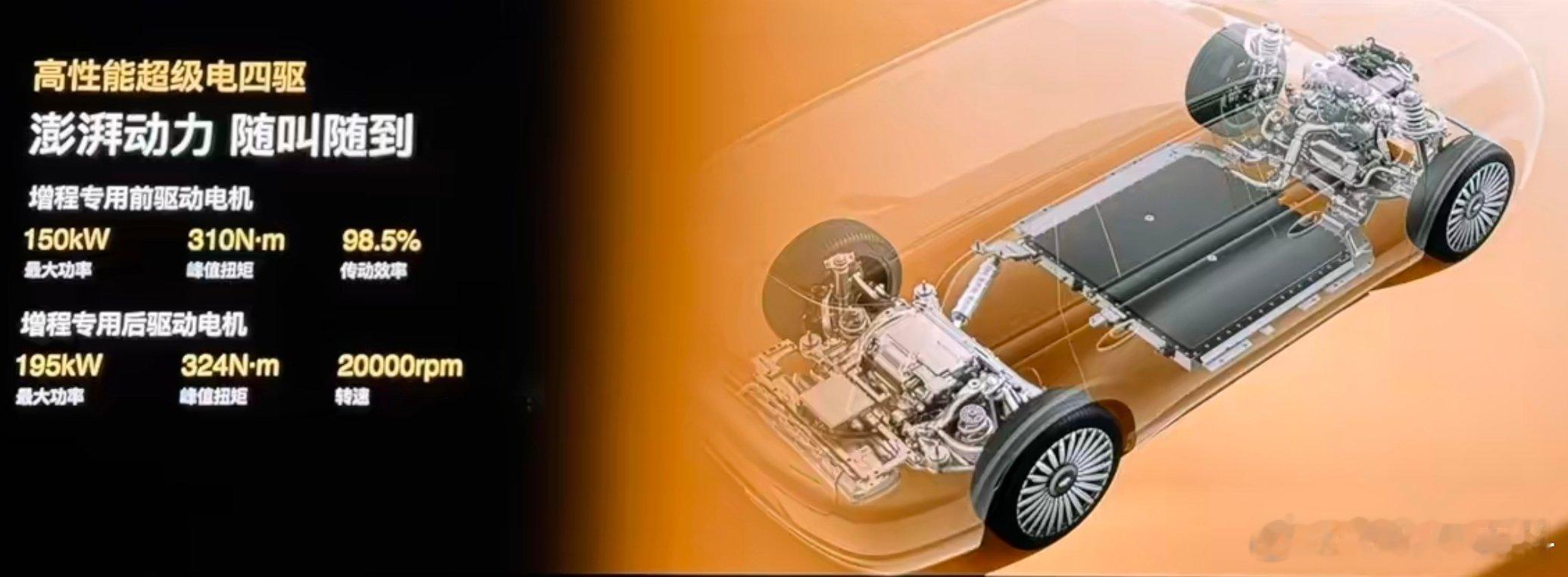 论三电,标配1.5T增程器(3.71kWh/L),后驱单电机195kW/324N·m+33.68度电,四驱双电机345kW/634N·m+39.92度电,CLTC纯电续航都是220km,且支持3C快充