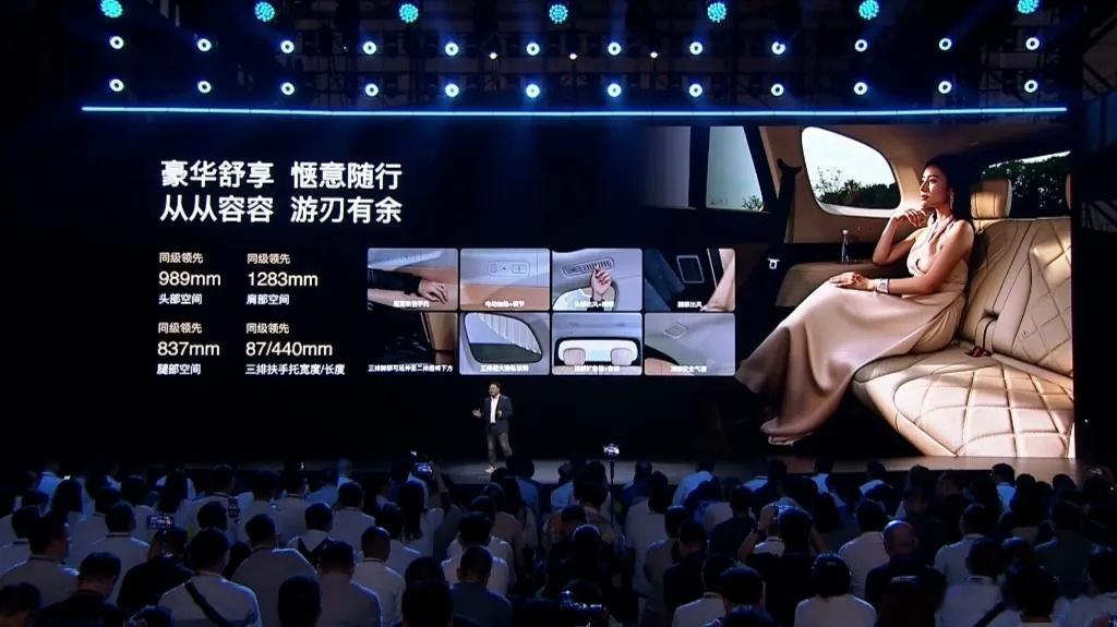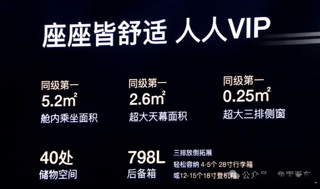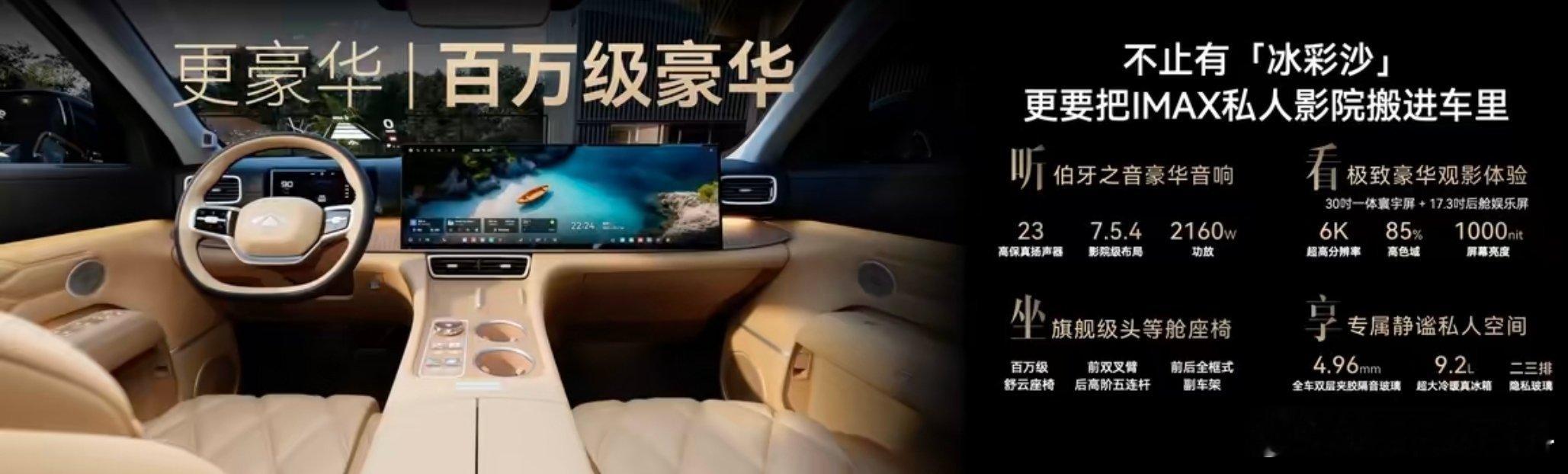 论配置,30吋一体寰宇屏,23扬伯牙之音7.5.4.2音响(2880W)、256色氛围灯、3种香氛主题、17.3英寸后舱娱乐屏,二排一键零重力/14向电调/横滑65mm/通风/按摩/腰托/加热、三排电调/加热、9.2L电动冷暖箱(-18~50℃)全都堆到位