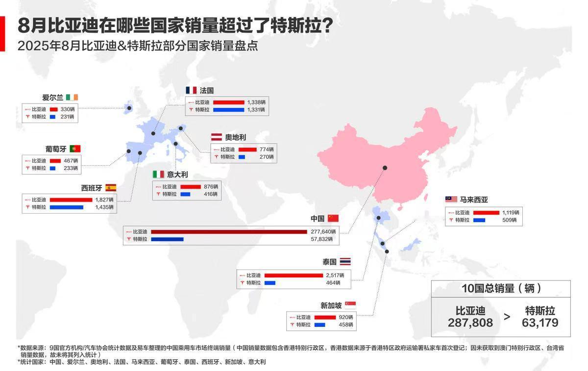继续攻城拔寨!不知不觉比亚迪已经连续四季度力压特斯拉 家人们,刚看到个大消息!2025 年第三季度,比亚迪在纯电汽车市场又把特斯拉甩在后面了! 咱们先看实打实的数儿:比亚迪这季度纯电车型卖了 582522 辆,特斯拉交付了497099 辆,一算下来,比亚迪单季度就多卖了85423 辆!而且更厉害的是,从2024 年第四季度到现在,比亚迪已经连续四个季度在全球纯电销量上压过特斯拉了。 再说说今年前九个月的成绩,比亚迪新能源汽车总共卖了 326 万台,这里面纯电车型占了快一半(49.26%),差不多 160.6 万台,妥妥的核心主力。现在连彭博社的分析师都预测,比亚迪今年纯电汽车交付量大概能到 217 万辆,而特斯拉平均预估才 161 万辆,可以说比亚迪持续扩大领先态势。 不光在国内能打,比亚迪在海外市场更是突飞猛进!今年 1-9 月,海外销量直接突破 70 万辆。就说 2025 年 8 月吧,不管是欧洲的西班牙、法国、意大利这些国家,还是东南亚的新加坡、泰国、马来西亚,比亚迪销量都超过了特斯拉,一路扩大领先优势,太给咱们中国品牌长脸了! 为啥比亚迪能在海外这么火?其实早有原因。一方面,比亚迪一直坚持 “技术为王,创新为本”,而且车型特别全,便宜的、贵的都有,能精准满足不同国家消费者的需求;另一方面,人家也不是随便把车运过去就完事儿了,还推进本地化生产,跟着当地政策调整,服务网络也搭得特别完善,这些事儿凑到一块儿,自然能在海外稳稳扎根。现在,比亚迪的新能源汽车已经卖到 116 个国家和地区了,足迹遍布全球!