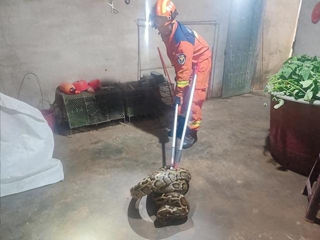 10月12日,儋州市大成镇西华农场一位村民家中鸡舍闯入一条重达30斤的大蟒蛇,由于该蛇体型较大,村民不敢轻举妄动,连忙报警求助。儋州市消防救援支队指挥中心接报后,立即调派1车6名消防救援人员前往现场处置。