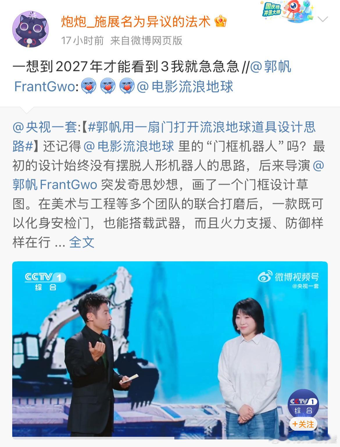 央妈也在催流浪地球3 郭导的奇思妙想造就了门框子这个经典。希望球3能有更酷的机器人,2027别让我们等太久!