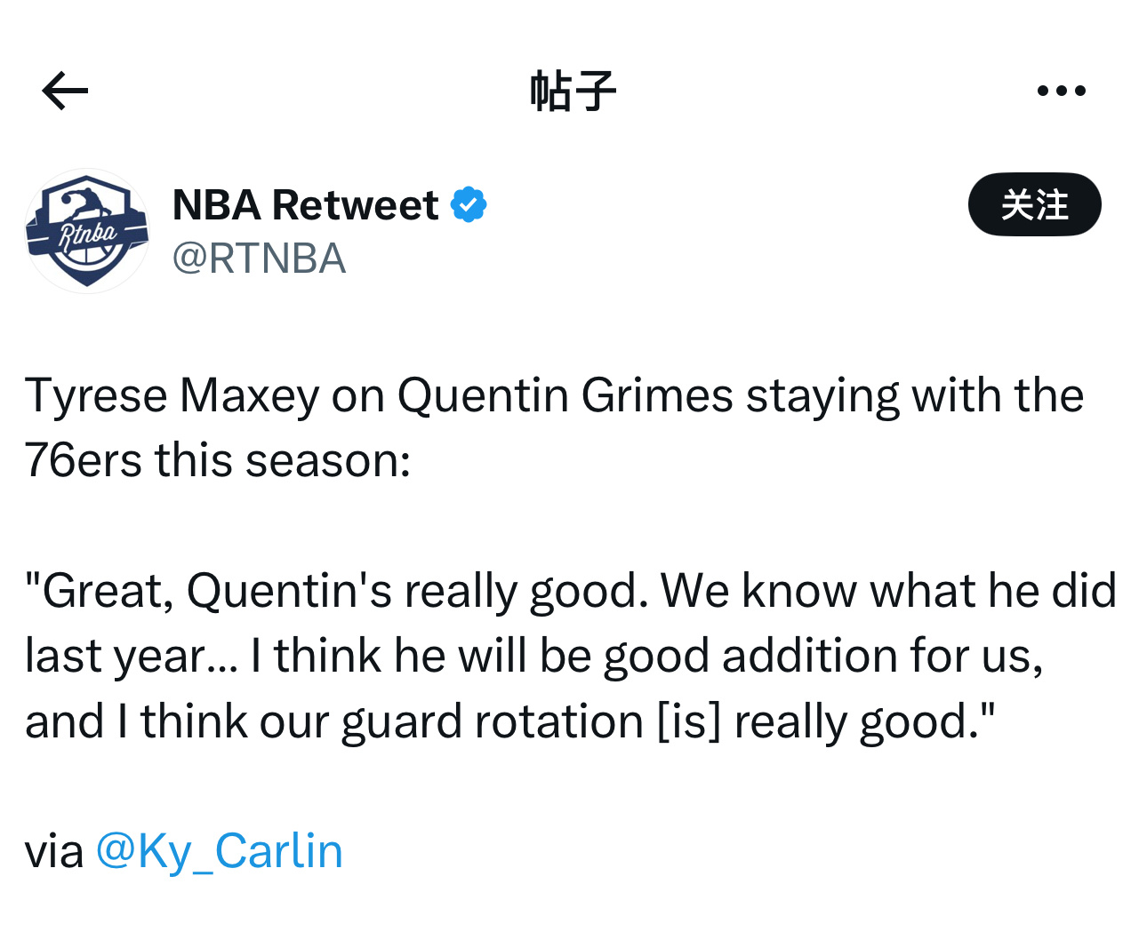 泰雷斯·马克西在采访时,谈及昆廷·格兰姆斯本赛季回归76人队[围观]