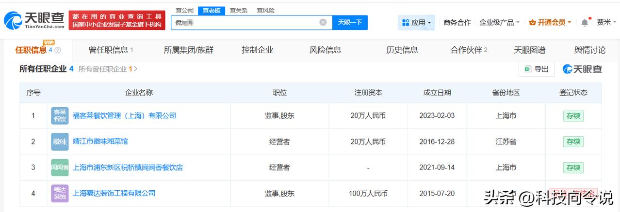 【揭秘鸭腿套餐现活蛆餐饮店 鸭腿套餐现活蛆餐饮店已成立4年 套餐现活蛆门店老板关联3家餐饮公司】官方通报鸭腿套餐发现有活蛆 据媒体报道,10月13日,上海市浦东新区市场监督管理局发布情况通报称,该局关注到有消费者在网上反映,10月11日中午在本辖区“闻闻香餐饮店”食用鸭腿套餐时,发现有“活蛆”。目前,涉事经营户已自行停业整改,该局对相关情况正在进一步调查核实。 天眼查App显示,涉事的上海市浦东新区祝桥镇闻闻香餐饮店成立于2021年9月,为个体工商户,经营者为倪某某,经营范围为餐饮服务。 任职信息显示,倪某某名下关联4家企业,其中3家处于存续状态,分别为福客莱餐饮管理(上海)有限公司、靖江市徽味湘菜馆、上海市浦东新区祝桥镇闻闻香餐饮店,而上海羲达装饰工程有限公司已被吊销。 天眼查信息: -c5153212793