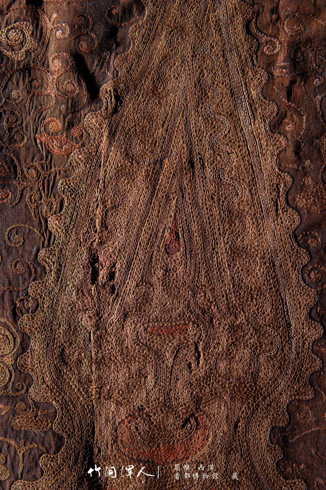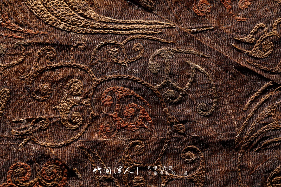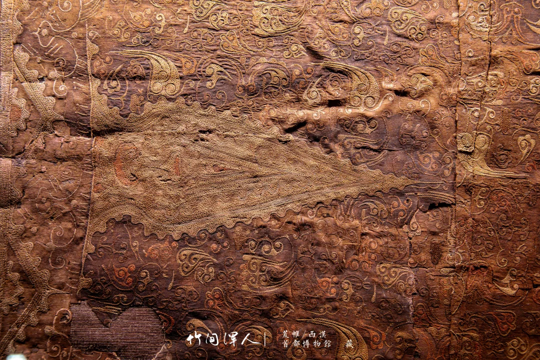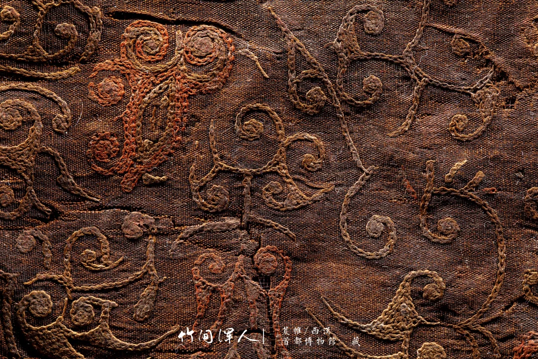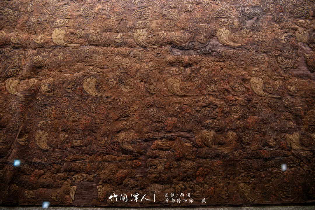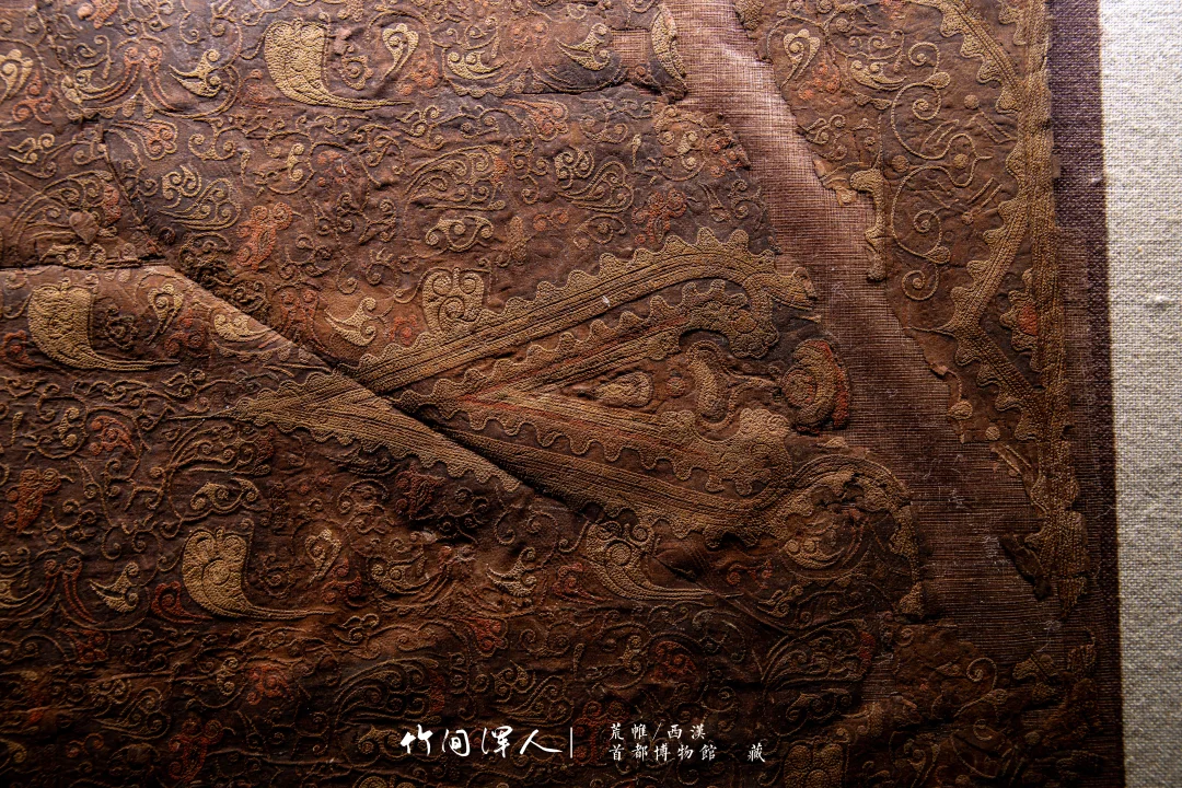 在微距镜头下能看到锁绣的细节,仔细看还可以看到当年染色的痕迹,汉代的想象力和审美总是这么让人叹为观止! . 荒帷/西汉(前206-8年) 石景山区老山汉墓出土 藏于:. 荒帷是装饰棺木的布帛。棺木外以木竹类材料结成形似居室的框架,即所谓“墙柳”,覆于墙柳之上的布帛称“荒”,缝于四周者称“帷”,形似帐幕,象征了逝者生前的居室。此荒帏绣工高超细腻,绣面平齐匀整,是汉代绣品中的杰作。 .