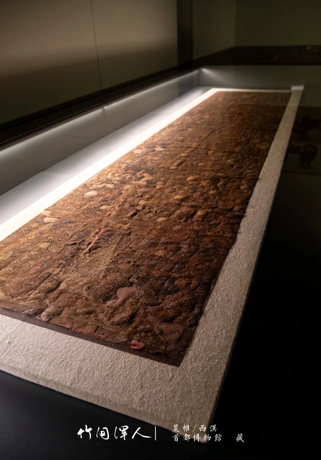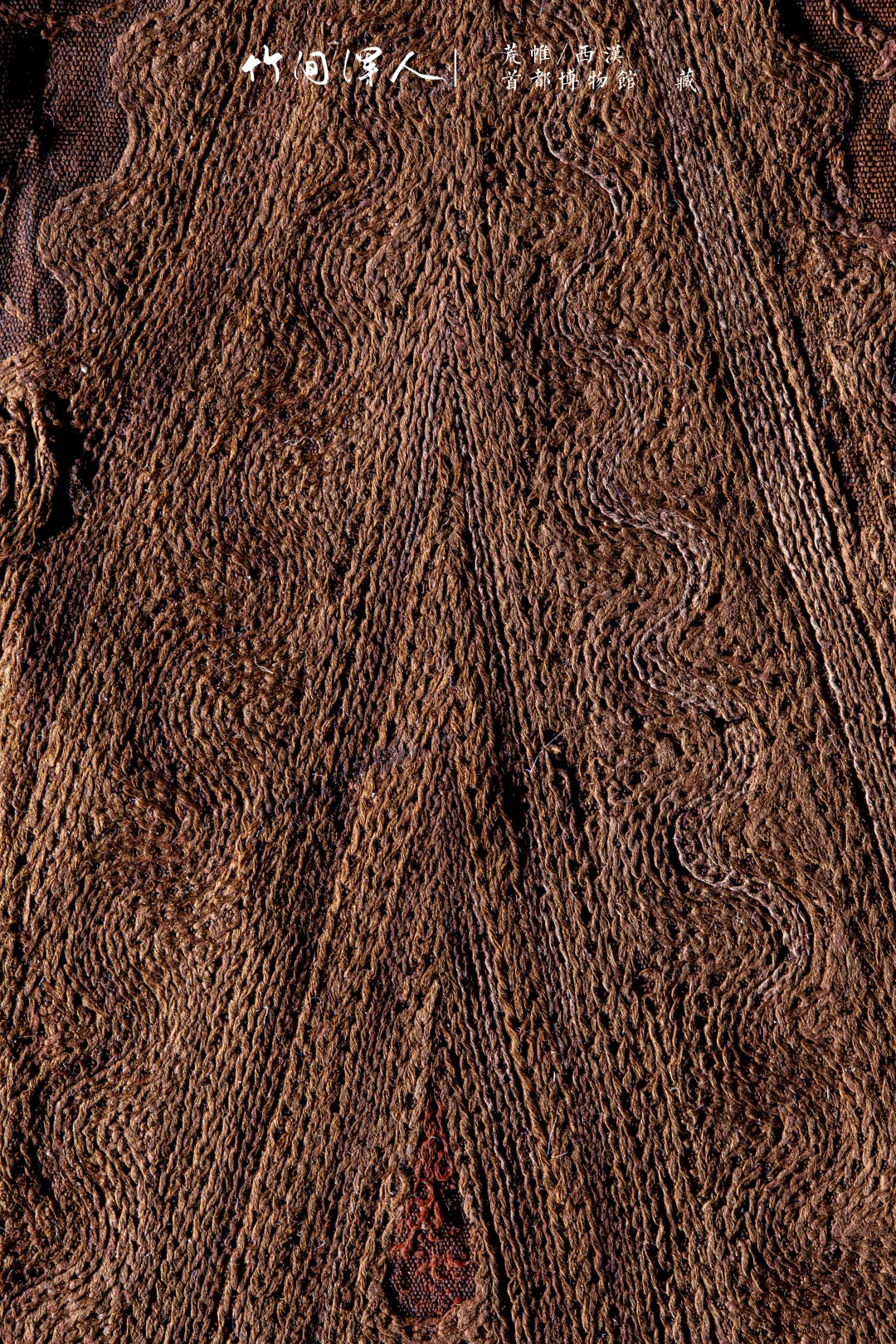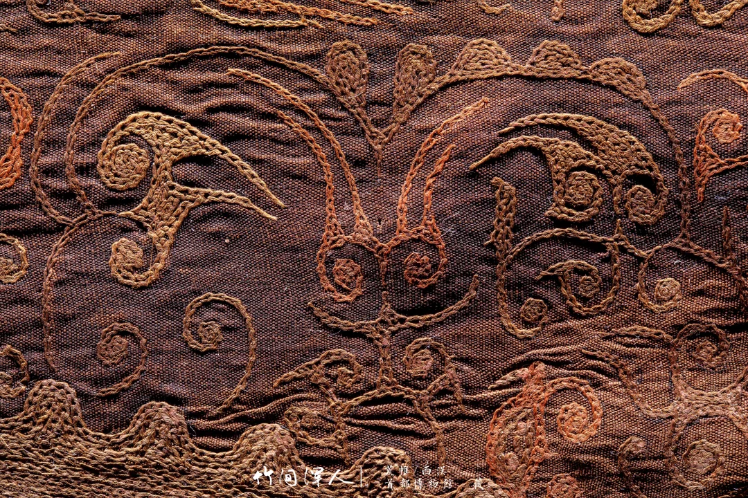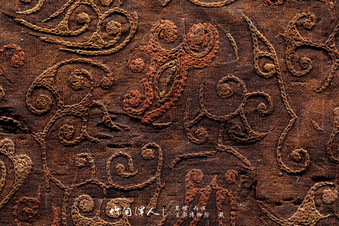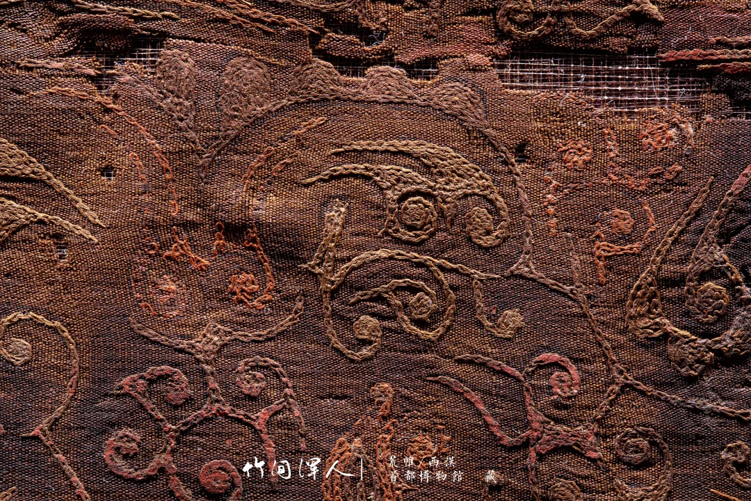 在微距镜头下能看到锁绣的细节,仔细看还可以看到当年染色的痕迹,汉代的想象力和审美总是这么让人叹为观止! . 荒帷/西汉(前206-8年) 石景山区老山汉墓出土 藏于:. 荒帷是装饰棺木的布帛。棺木外以木竹类材料结成形似居室的框架,即所谓“墙柳”,覆于墙柳之上的布帛称“荒”,缝于四周者称“帷”,形似帐幕,象征了逝者生前的居室。此荒帏绣工高超细腻,绣面平齐匀整,是汉代绣品中的杰作。 .