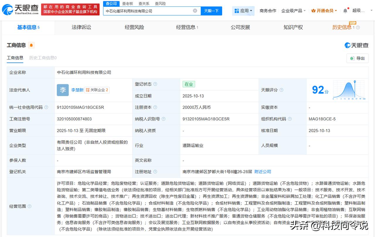 【中石化成立循环利用科技公司注册资本2亿】 天眼查App显示,近日,中石化循环利用科技有限公司成立,法定代表人为李楚新,注册资本2亿人民币,经营范围包括再生资源加工、再生资源销售、新材料技术推广服务、工业互联网数据服务等,由中国石化化工销售有限公司全资持股。 天眼查信息: