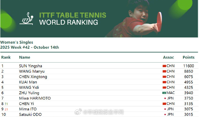 #孙颖莎连续170周世排第一#【#国际乒联2025第42周排名发布#】14日,国际乒联更新2025年第42周世界排名:女单方面,11600分连续第170周霸榜第一,8850分排名第二,陈幸同6075分排名第三。男单方面,10900分排名第一,8075分排名第二,雨果6050分排名第三。一起为国乒加油!(中国新闻网)