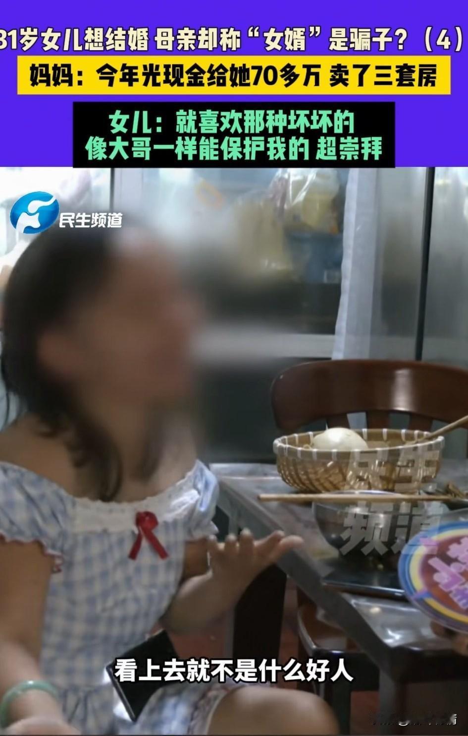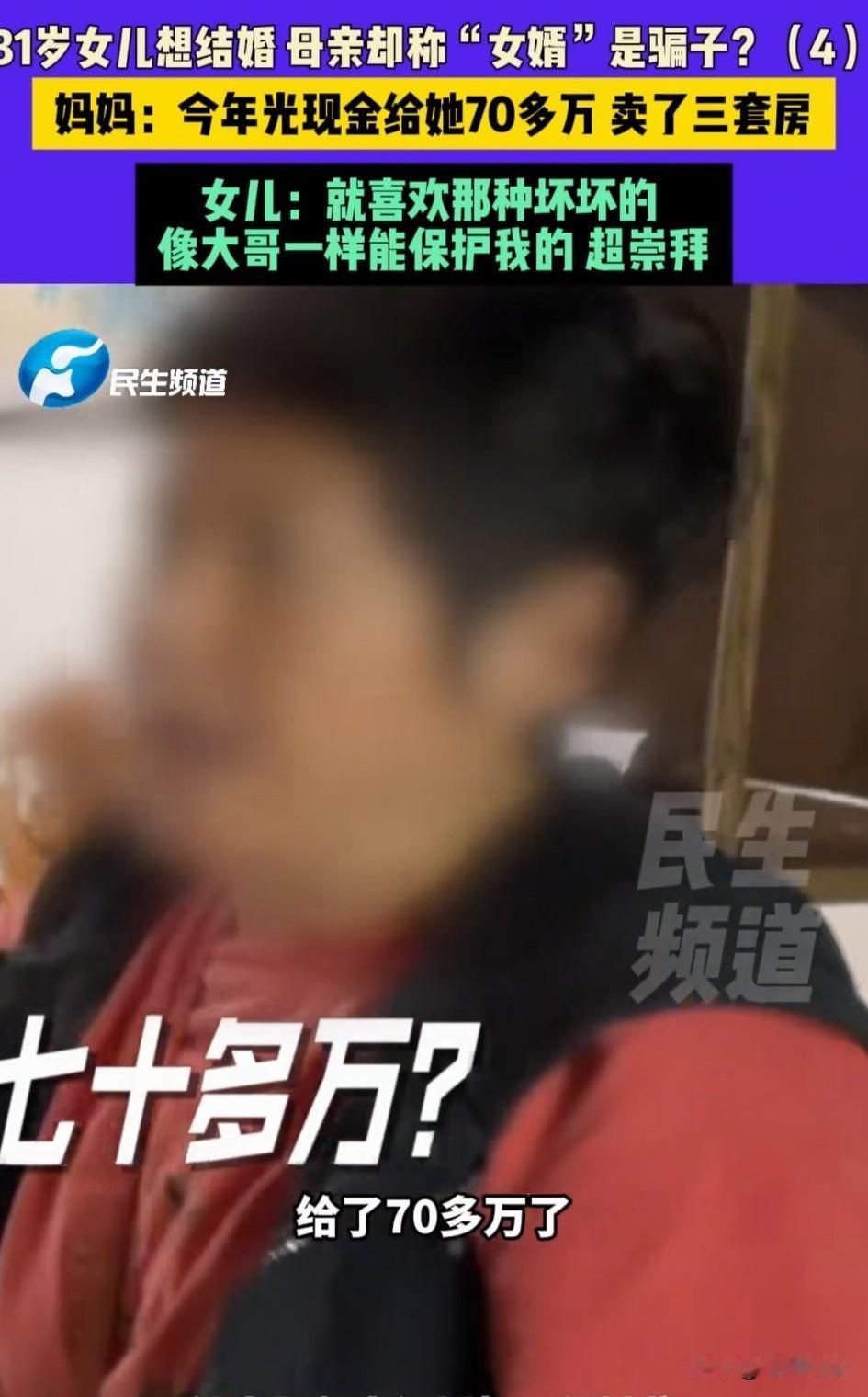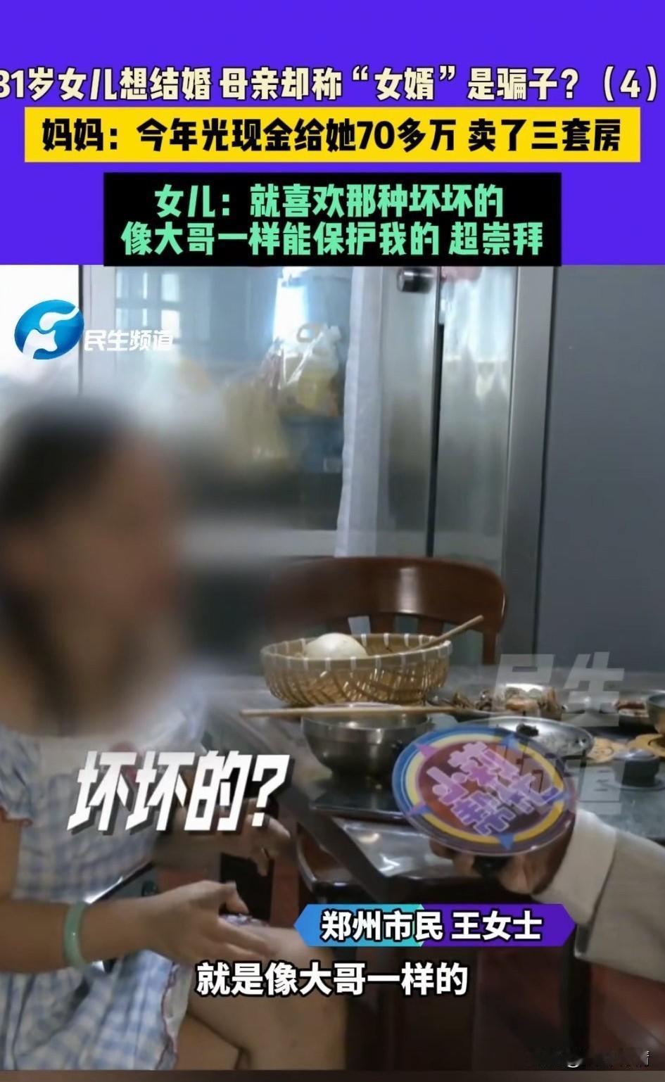 31岁郑州大龄优质女和妈妈吵架, 我就要嫁给他, 妈妈认为女友的的男朋友是骗子, 女儿对着妈大吼大叫, 女儿认为妈妈给男友要房产证, 男友不给母亲就说对方是骗子, 这让自己非常生气, 表示她无凭无证不能说我对象是骗子, 我和他都同居过, 女孩的妈妈表示今年光给对方现金都70多万了,天天变着法的要钱, 自己家元月份到现在都卖了三套房, 家底都快被这个准女婿掏空了 女生也是恋爱脑, 妈妈越阻止她越是想要和对方在一起, 还表示自己要去英国和婆婆住一起, 还没结婚都幻想着去英国和对象妈妈在一起住。 女生妈妈给对方一家打电话对方都不接,这女生估计是恋爱脑上头了, 对方要是正常人家也么会这样, 不和亲家母见面只要钱, 还想诱骗女生去英国, 妈妈也是愁死了, 找来记者调解, 女孩告诉记者她男朋友和她一样就是他让你干嘛你不干嘛他就生气了, 所以不和我家人见面, 自己是非常喜欢那种坏坏的, 看着像大哥一样的可以保护自己的, 就是那种一出场看上去就不像好人的那种,超崇拜的! 她母亲在旁边都听不下去了, 问她,他家在哪呢?你知道吗?你去过吗?女生气的说我们都同居过得! 还真是男人越坏女人越爱, 这样的女生太愁人了! 大家对于这样的郑州女生怎么看? 婚姻与家庭 一起聊聊爱情 爱情究竟是什么样子的 郑州情侣分手 河南女子的遭遇