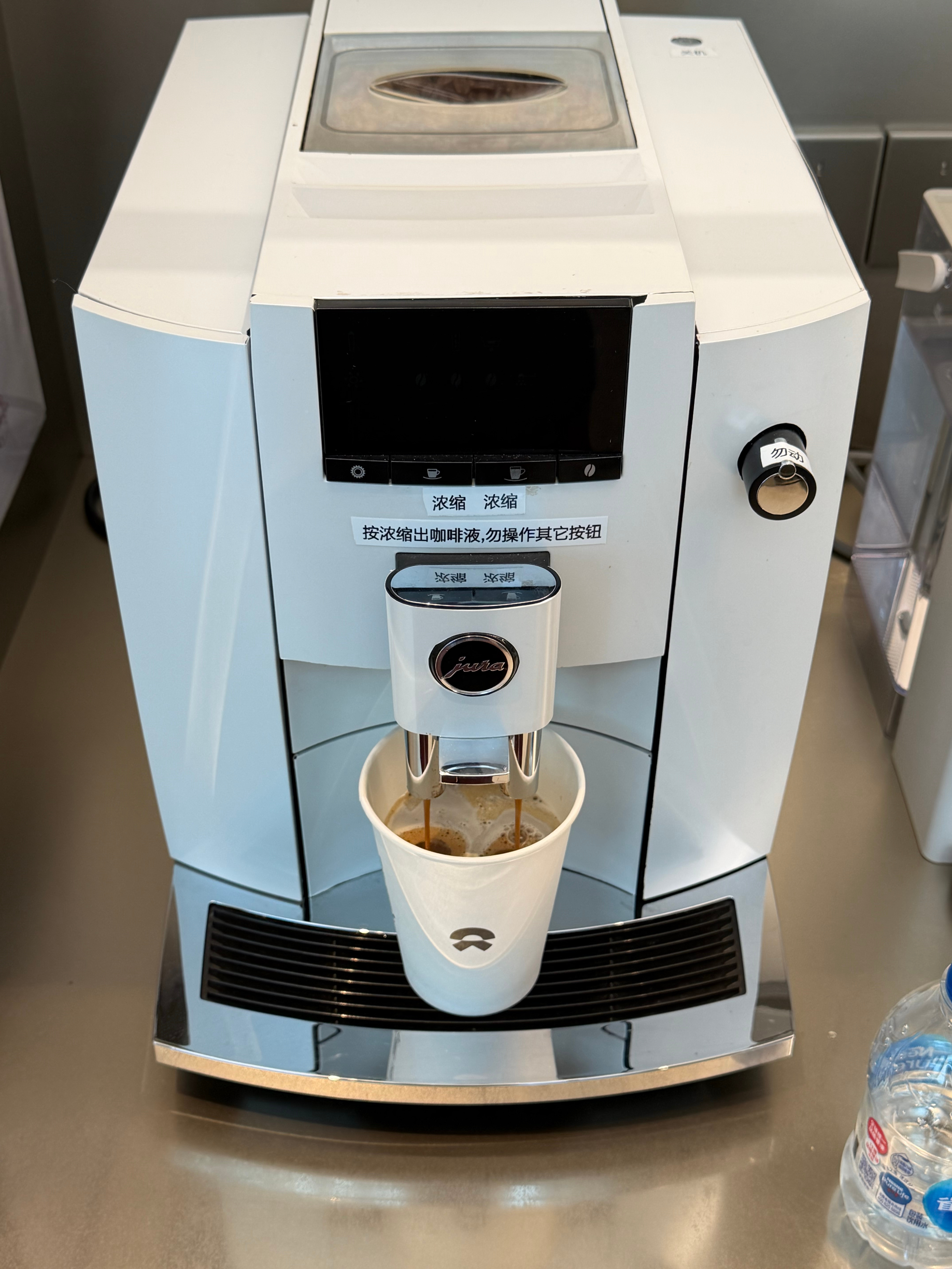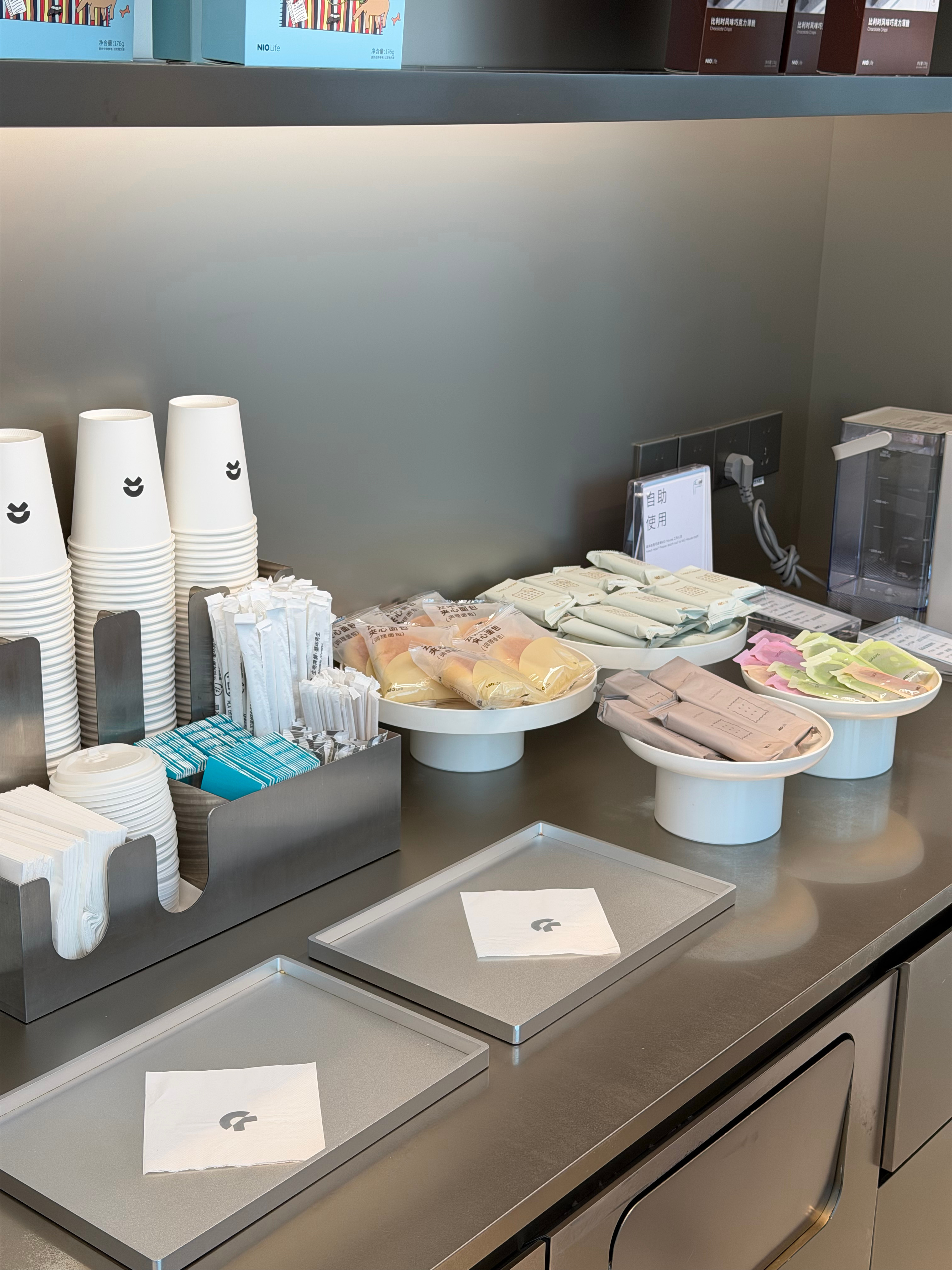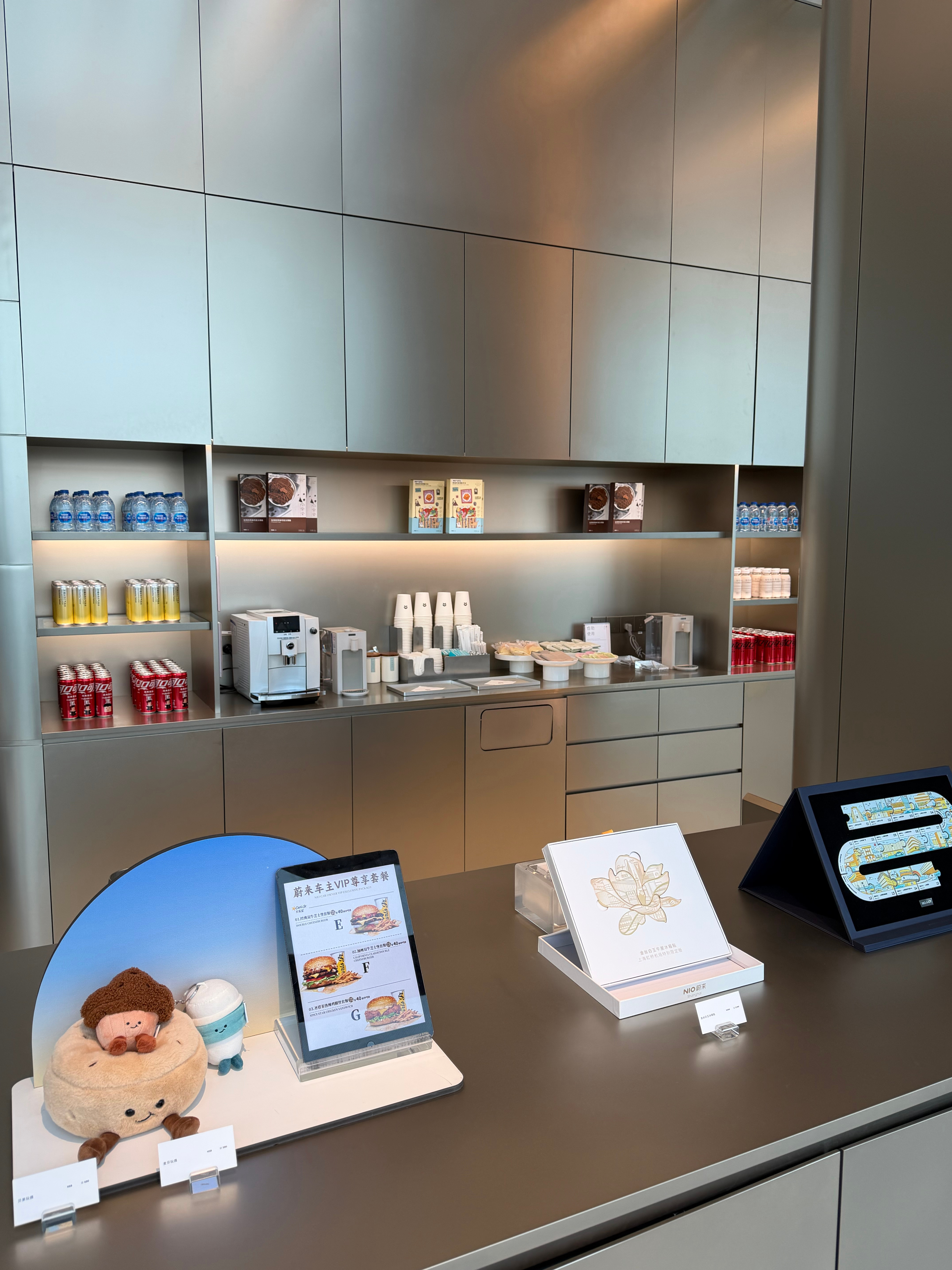 面积不大,但设计看着挺高级。免费提供蔚来商城的饼干、小面包之类,没有热食,不过可以付费买汉堡。水和饮料、咖啡随便取。进门需要扫码,预约制,只要是蔚来车主就可以免费使用。