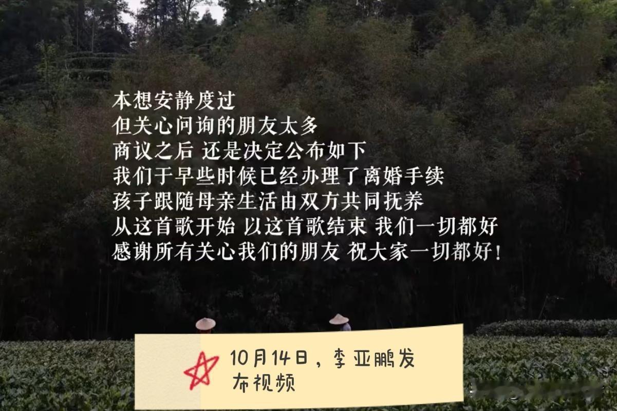 10月14日,李亚鹏微博宣布离婚! 2022年两人结婚,此前感觉海哈金喜人挺好