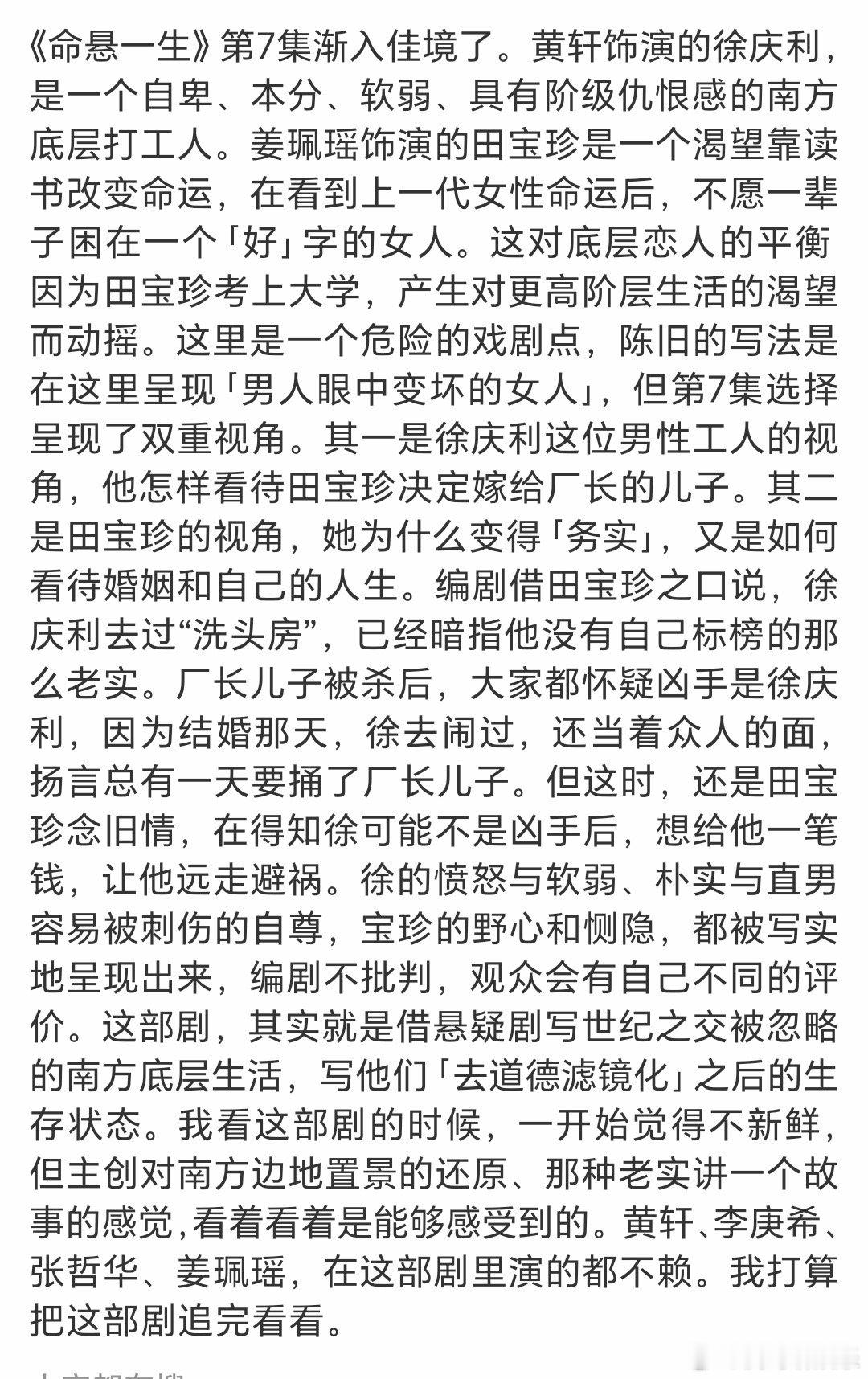 命悬一生第7集8分43秒电视剧命悬一生 谁懂啊?田宝珍和吴细妹的这一眼对视,包含了太多东西!彼时一个还在质问徐庆利要什么,一个已依赖混混,而发廊的线索早已埋下,太会了! ​​​