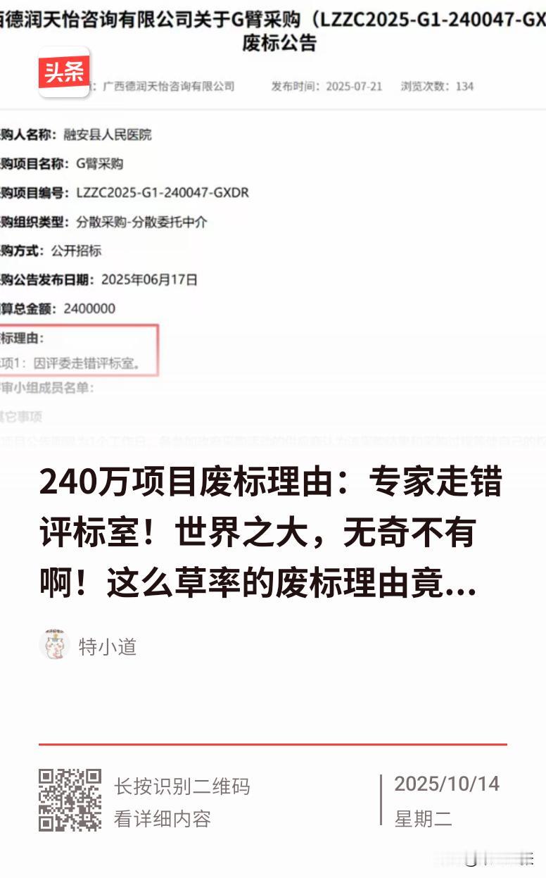 广西一项240万的医疗设备政府采购项目,废标理由竟是“评委走错评标室”,实在离谱!政府采购中,草率废标的情况并不少见。 部分“废标专家”滥用评审权,或挑采购文件“硬伤”,或对投标文件吹毛求疵,致使项目废标。如2400万的儿童公园物业管理项目,因标书中承诺函位置无索引,专家未找到评错,最终废标重招。这些废标理由令人无语,望相关流程更加严谨,不再如此儿戏。