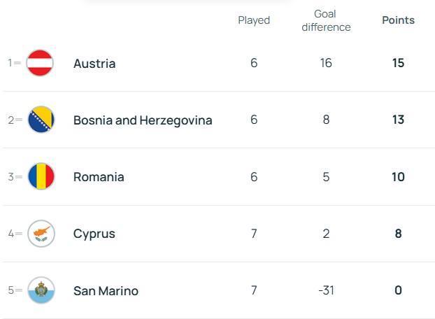 从小组形势分析,圣马力诺末轮对手罗马尼亚队,正与奥地利、波黑队争夺H组前两名,净胜球是决定排名的关键因素。昨天比赛中,罗马尼亚1-0绝杀奥地利后积10分,仅落后H组第二名波黑队3分。若下一轮罗马尼亚击败波黑,两队积分将相同,末轮罗马尼亚对阵圣马力诺,波黑则迎战奥地利,届时积分持平的情况下,净胜球将决定小组第二归属。