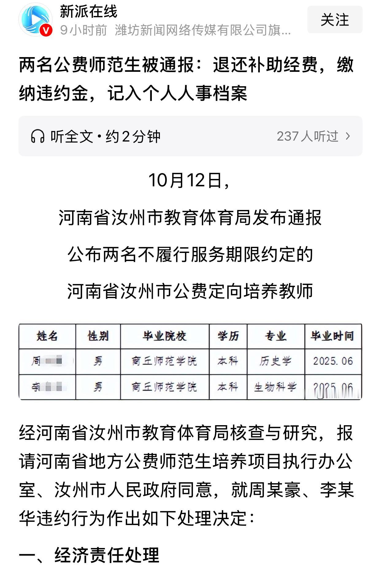 近日,两名河南公费师范生被通报:退还补助经费、缴纳违约金51000的,记入个人人事档案。 这两人是怎么回事?既然不想履行约定,当初为什么要去读? 当初认为老师是保底的工作,毕业了找到更好的单位,就宁愿违约也不去教书了吗? 还占了名额!其他的同学想去被挤下了!现在编制太难考了,如是当时不喜欢当老师就不应该占用这类指标,如果让给更需要的人会改变别人一生,现在占了又违约一点契约精神都没有。 大家对此怎么看?