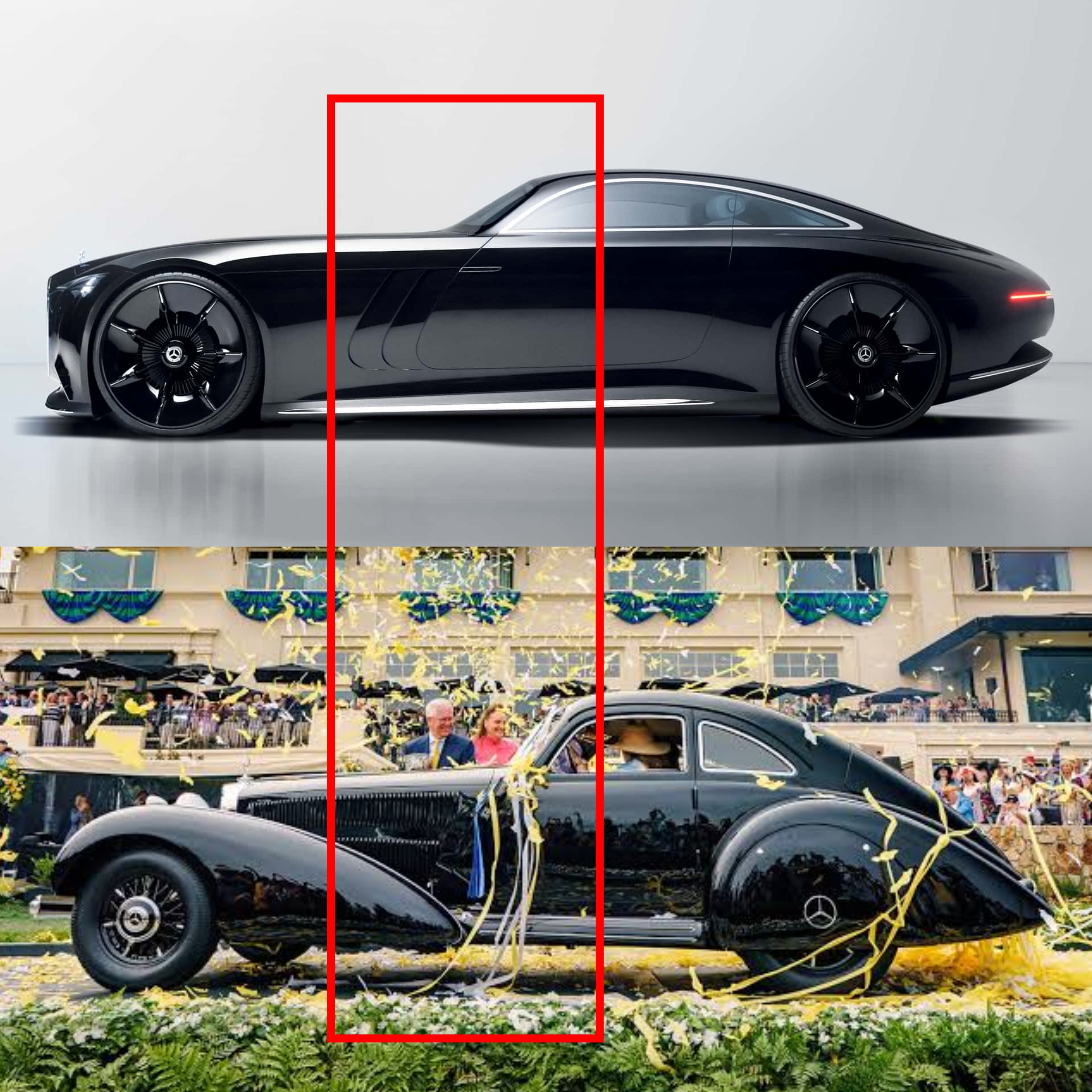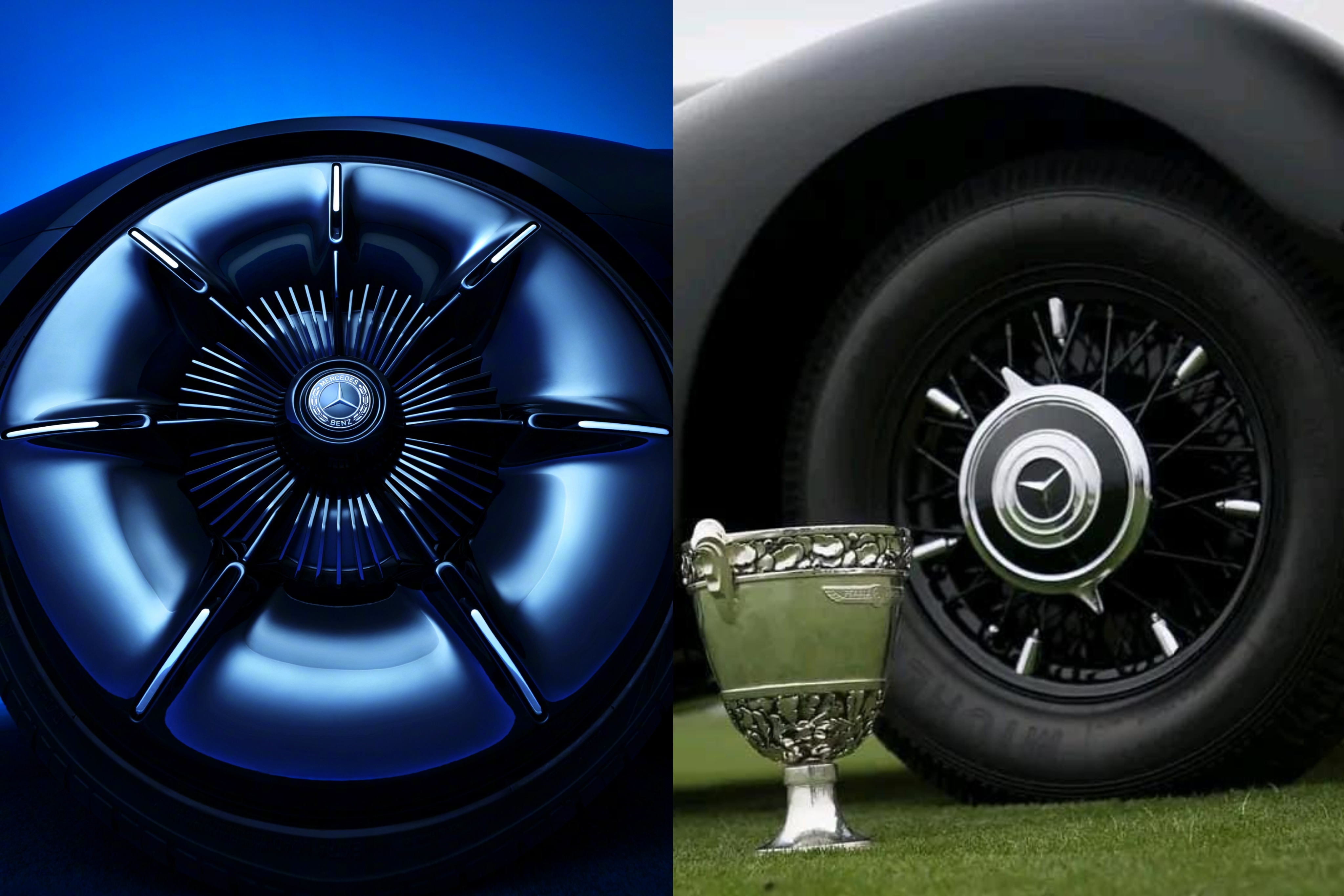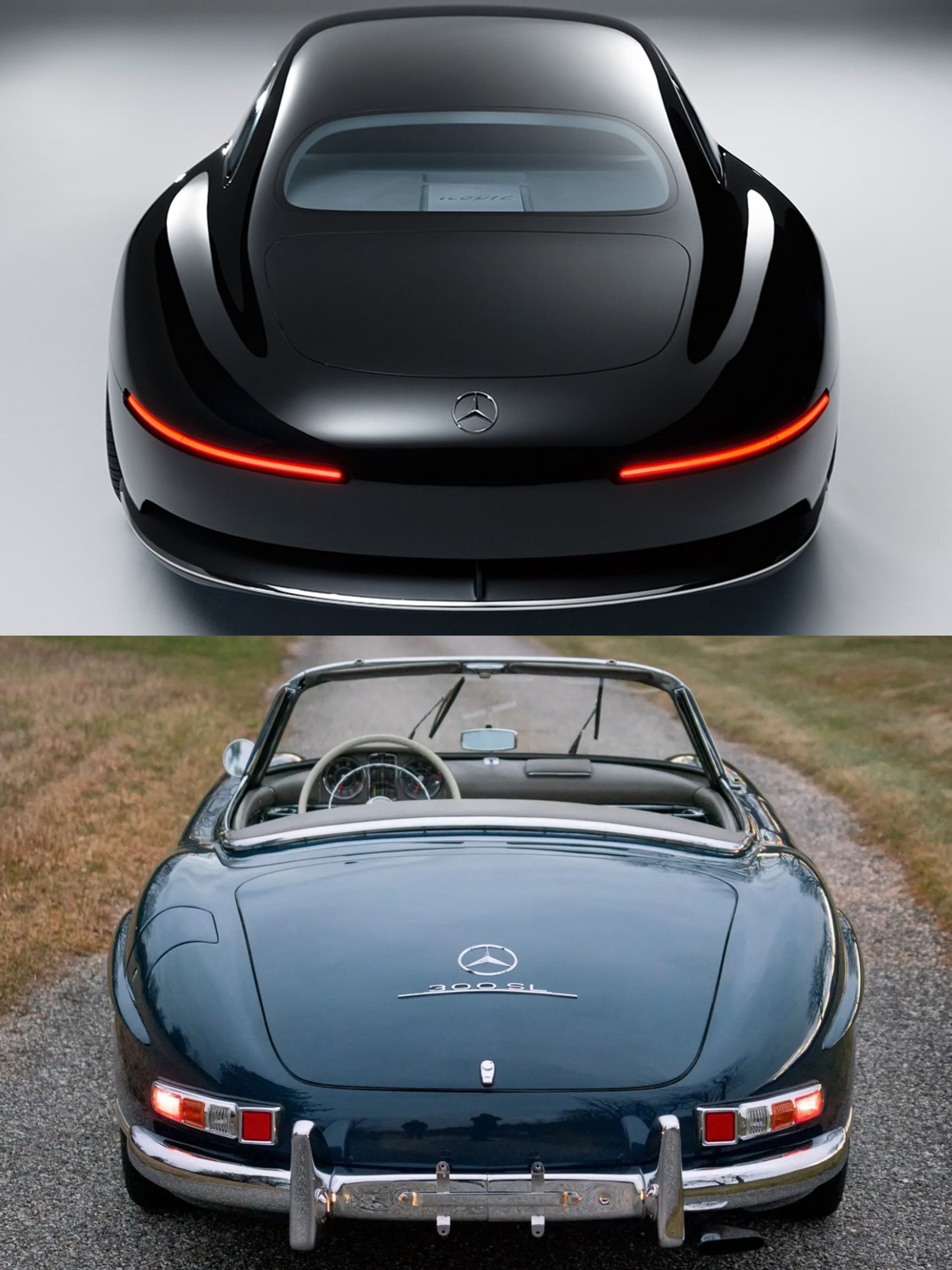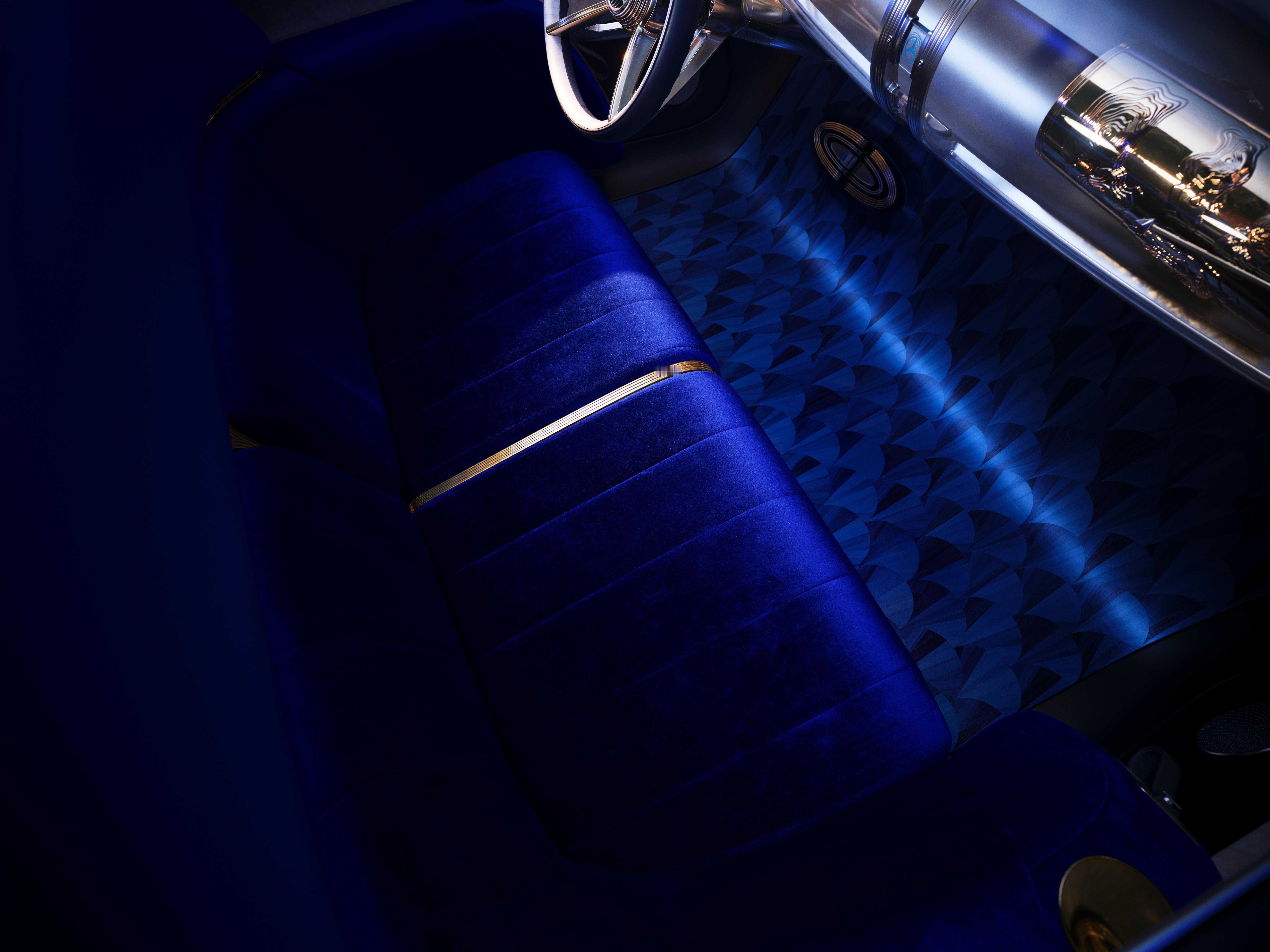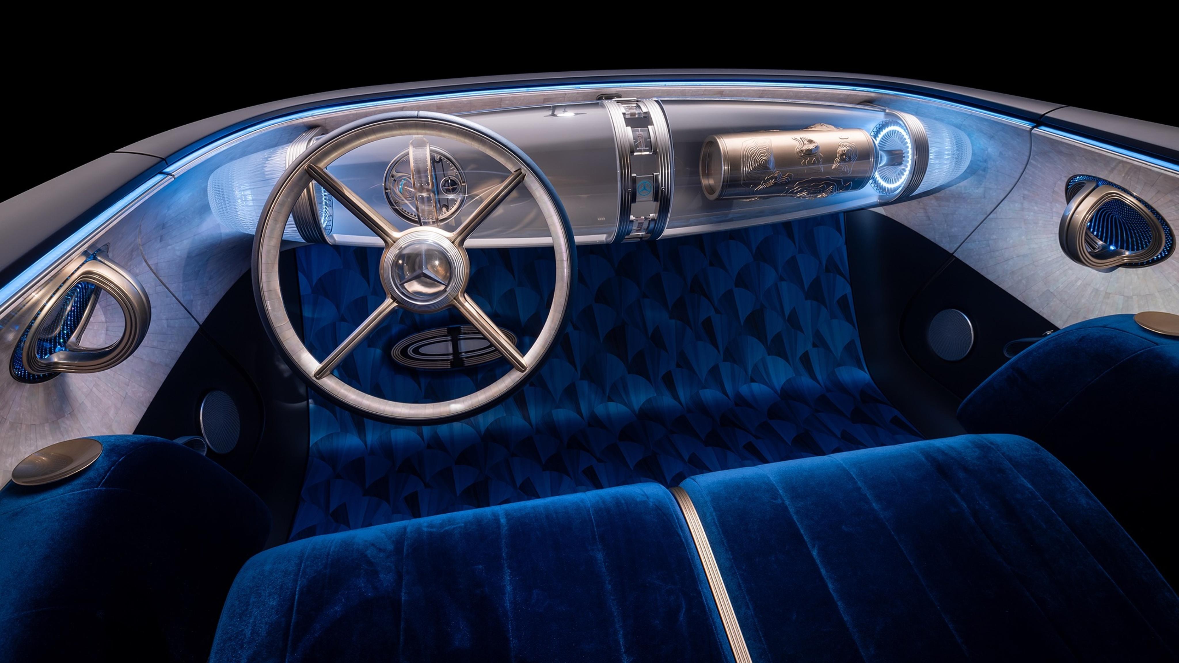 齐柏林飞艇造型的中控,四辐十字方向盘,装饰艺术影响的悬浮玻璃结构和金属细节,流线型现代主义的圆润车身和细节致敬,轮毂也像是在致敬,复古盾形格栅,300SL尾部,蓝色稻草镶嵌工艺的地板,蓝色天鹅绒长椅~VISION ICONIC概念车