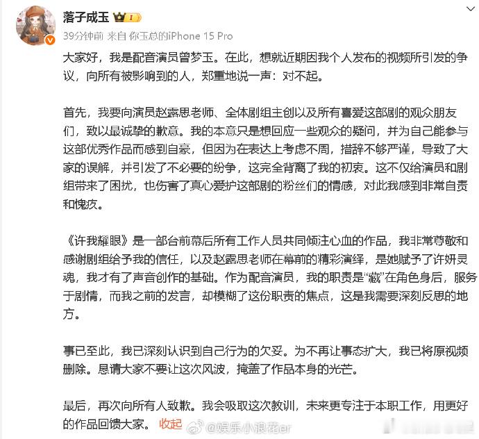 许我耀眼许妍配音演员发博道歉《许我耀眼》许妍配音演员道歉:“我的本意只是想回应一