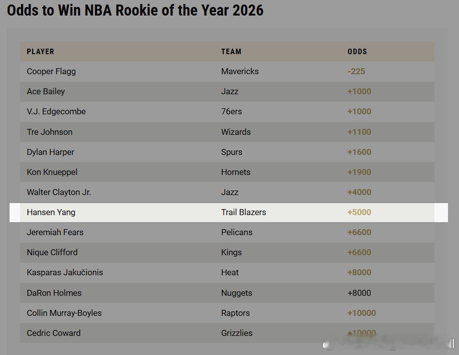 美媒公布2026年NBA年度最佳新秀赔率:弗拉格领跑,杨瀚森第8