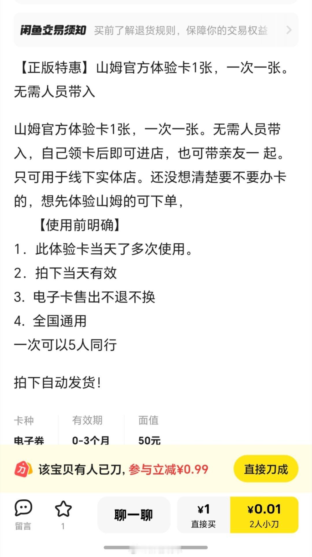 有偿带人进山姆5元一个人头某鱼上有人卖0.01体验卡,还可以5人同行,这些黄牛都