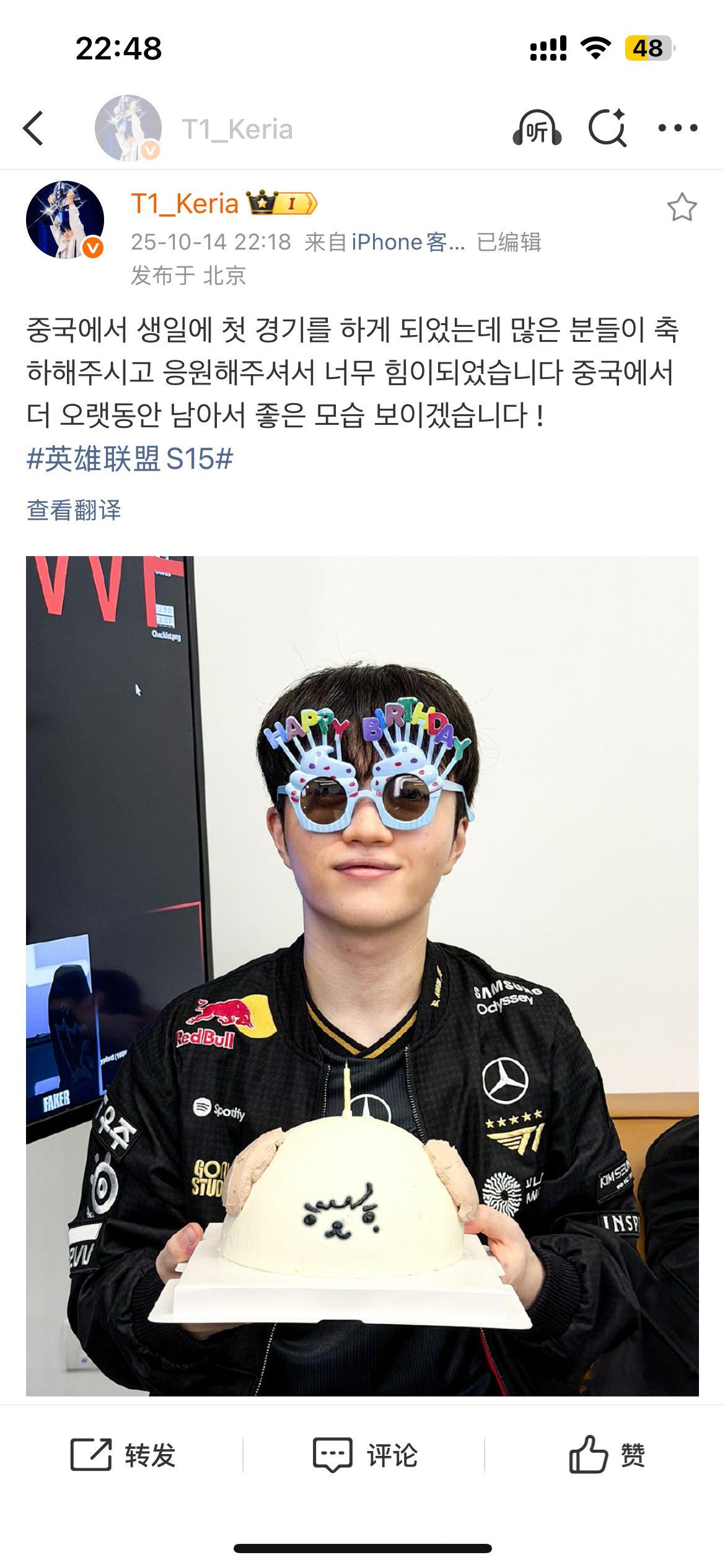 Keria发博:第一次在中国打比赛过生日 很多人祝贺我 为我加油 我得到了很多力量 我会留在中国更长时间,展现更好的样子!