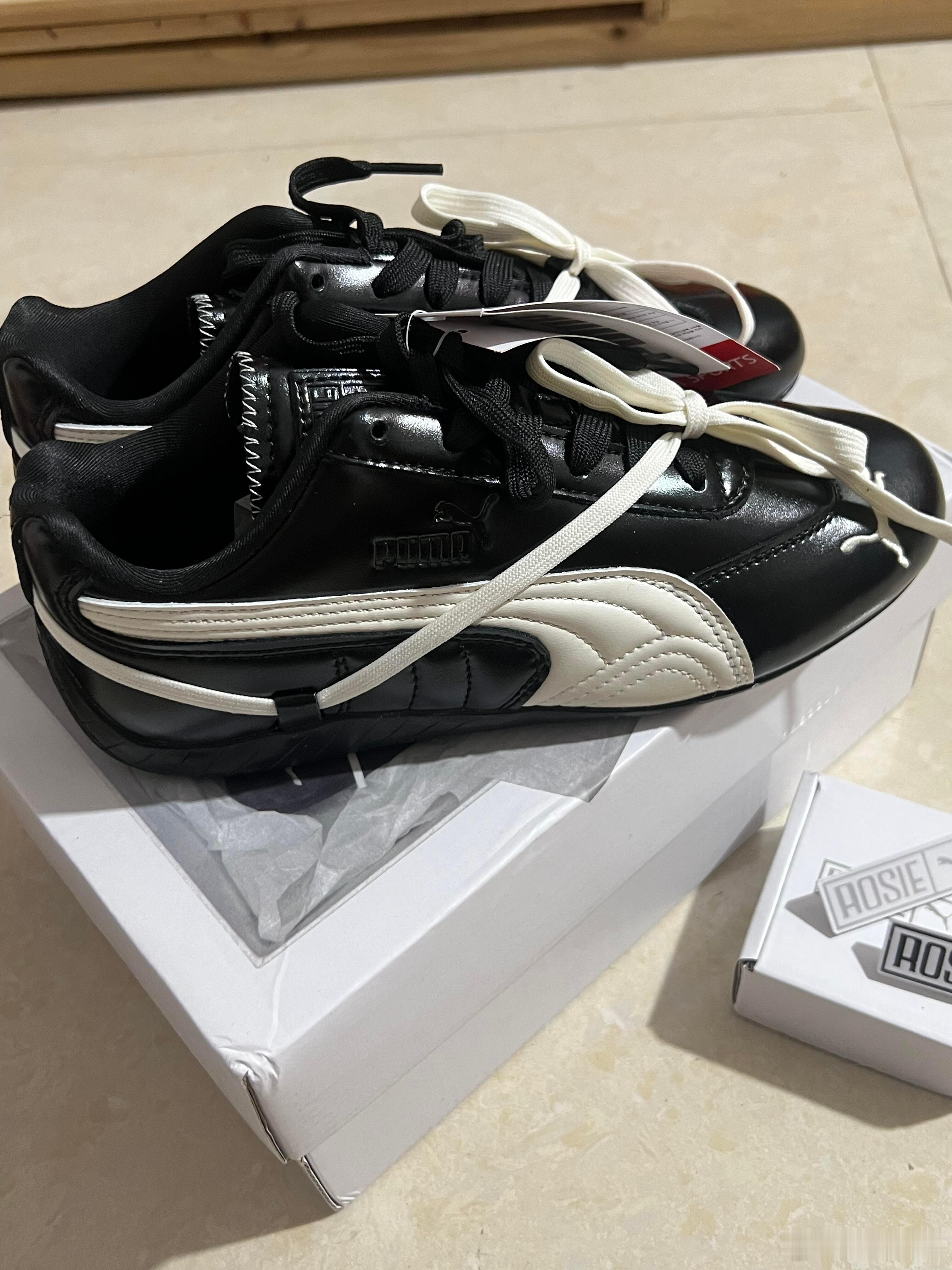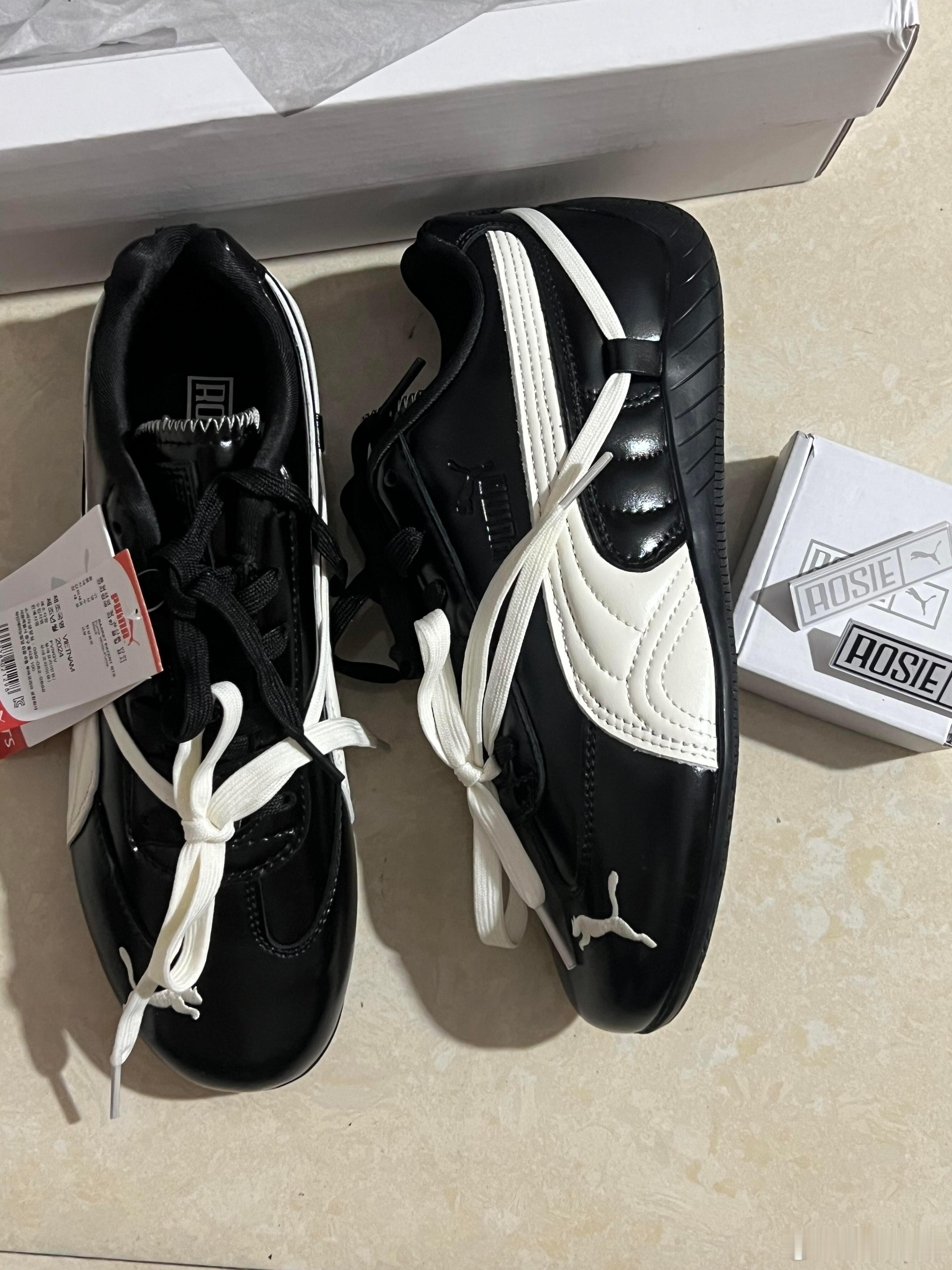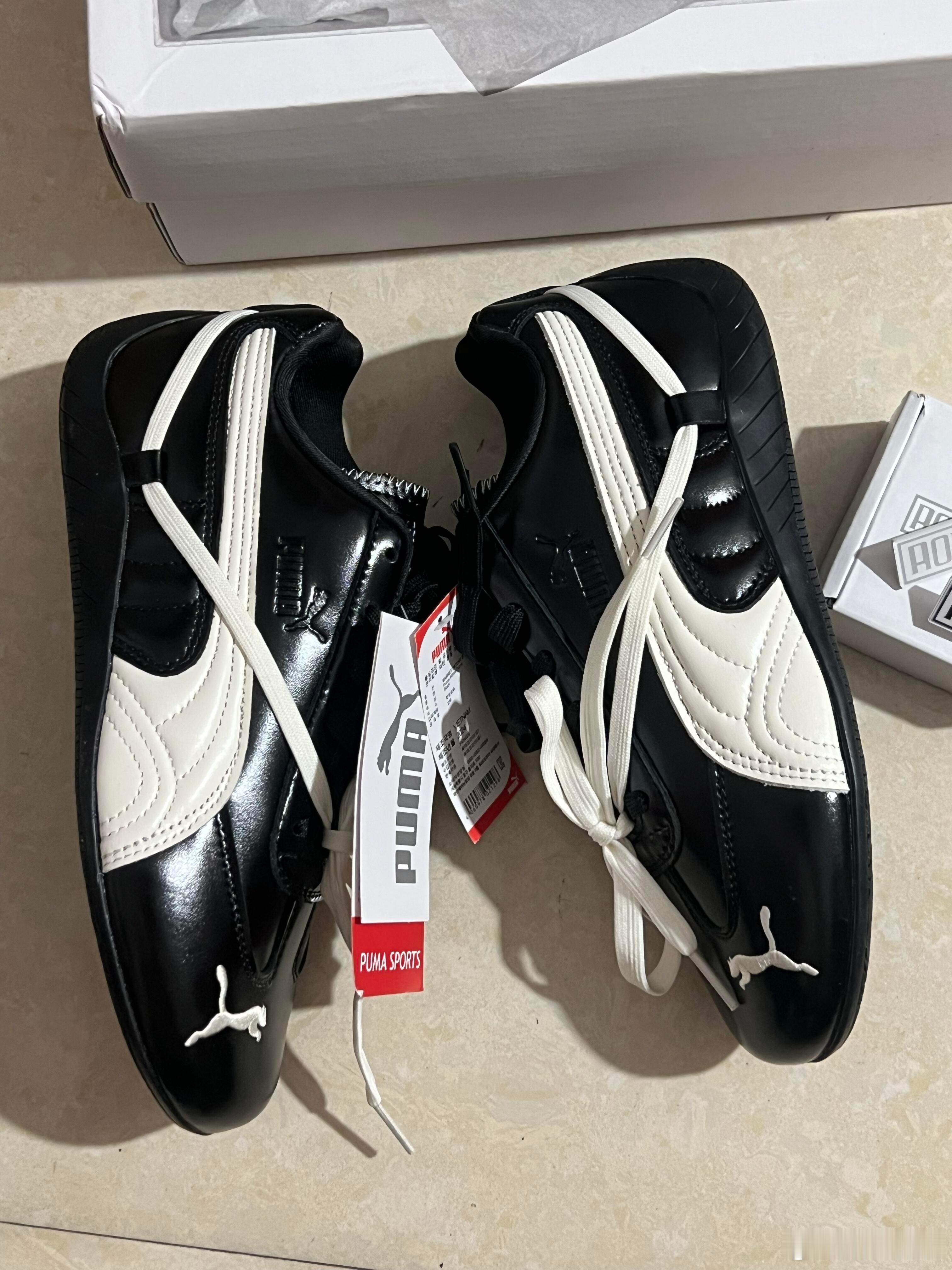 这是一双设计经典的黑白配色PUMA赛车鞋。鞋身采用光泽感十足的黑色皮革制成,侧面