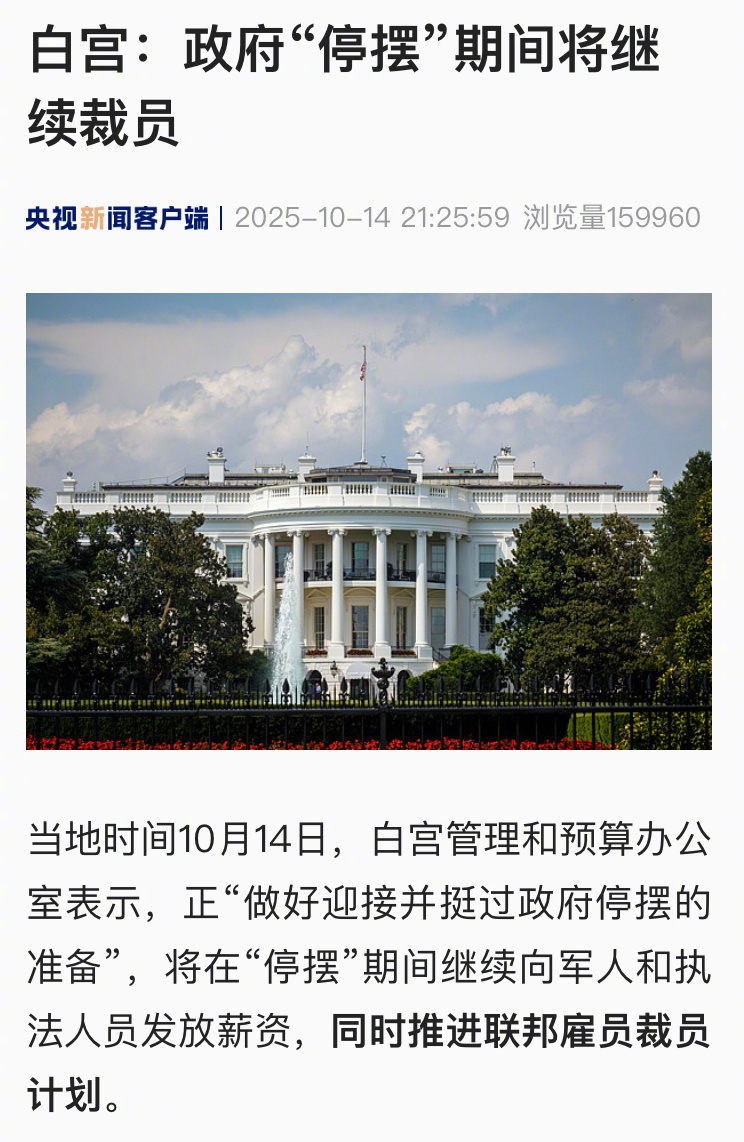 【白宫:政府“停摆”期间将继续裁员】当地时间10月14日,白宫管理和预算办公室表示,正“做好迎接并挺过政府停摆的准备”,将在“停摆”期间继续向军人和执法人员发放薪资,同时推进联邦雇员裁员计划。#美国海军图片展示俄舰艇#