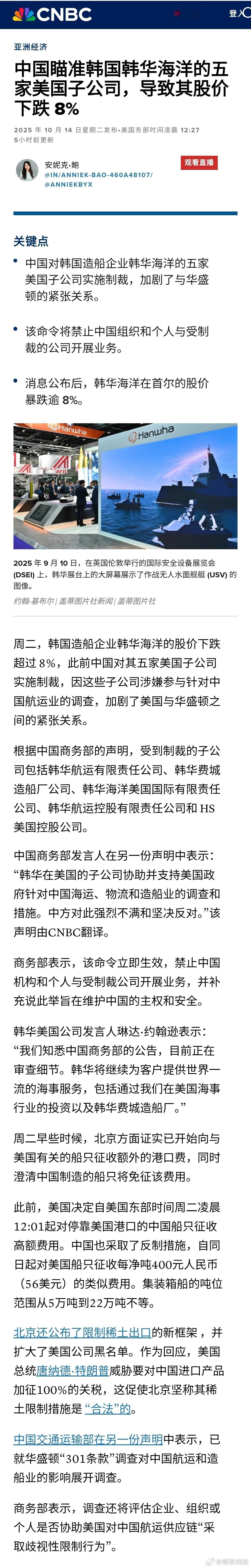 【中国瞄准韩国韩华海洋的五家美国子公司,导致其股价下跌 8%】