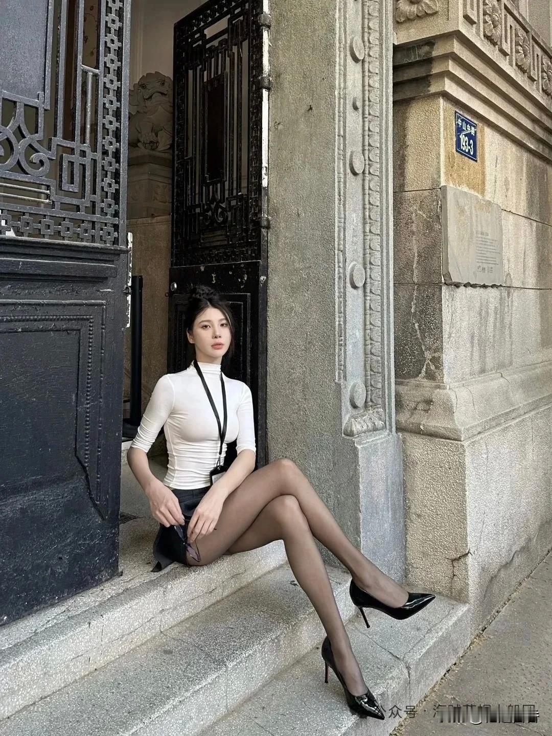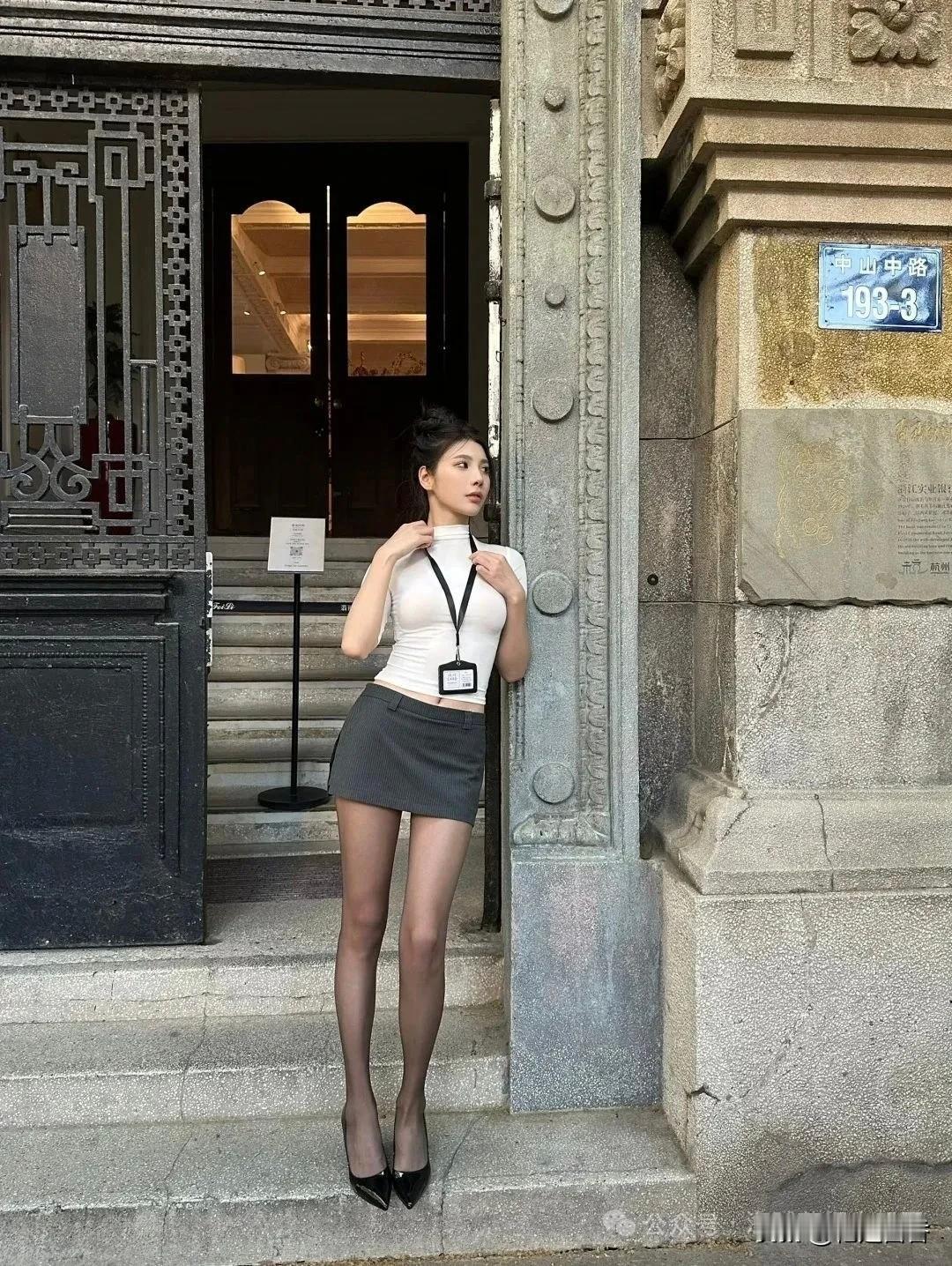 灰色超短裙搭配黑丝也是一绝,爱了爱了!