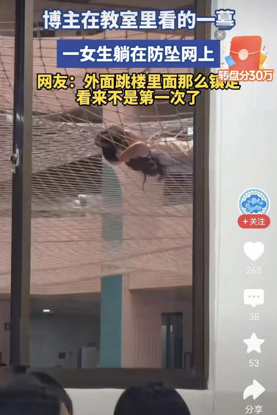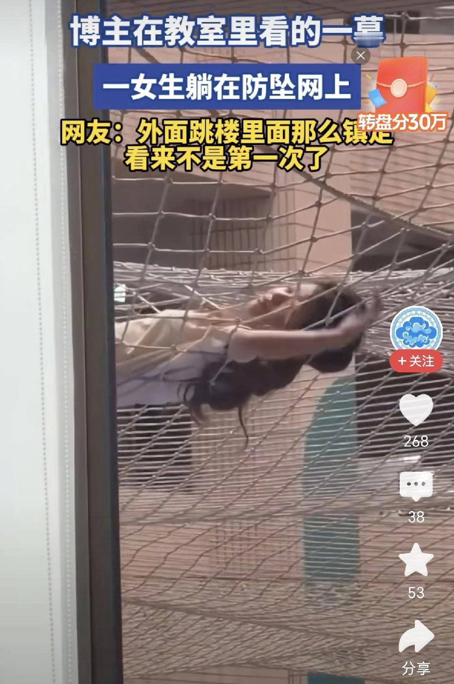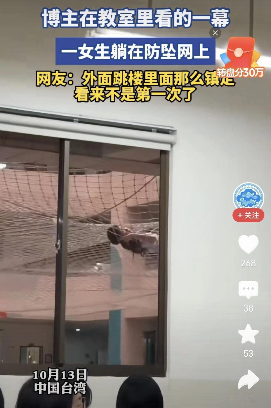 一宝岛博主在网上晒出一幕,让人心里纠结的很。 只见宝岛某个中学,楼下都设置了防坠网,有一女生挂在上面,显然是跳楼而下。 教室里的学生都好似习以为常,并不意外。 有网友说,看来不是第一次发生这种事了。 很多人会问,现在的中学生都怎么了?