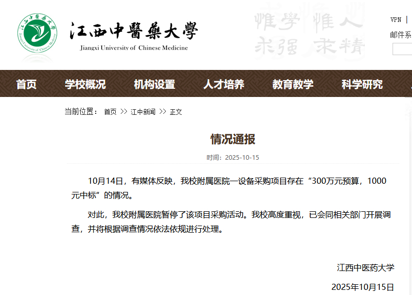 【#高校通报采购项目300万预算1000元中标#】#千元中标300万预算采购项目已暂停# 10月15日,江西中医药大学发布情况通报:10月14日,有媒体反映,江西中医药大学附属医院一设备采购项目存在“300万元预算,1000元中标”的情况。对此,江西中医药大学附属医院暂停了该项目采购活动。江西中医药大学高度重视,已会同相关部门开展调查,并将根据调查情况依法依规进行处理。