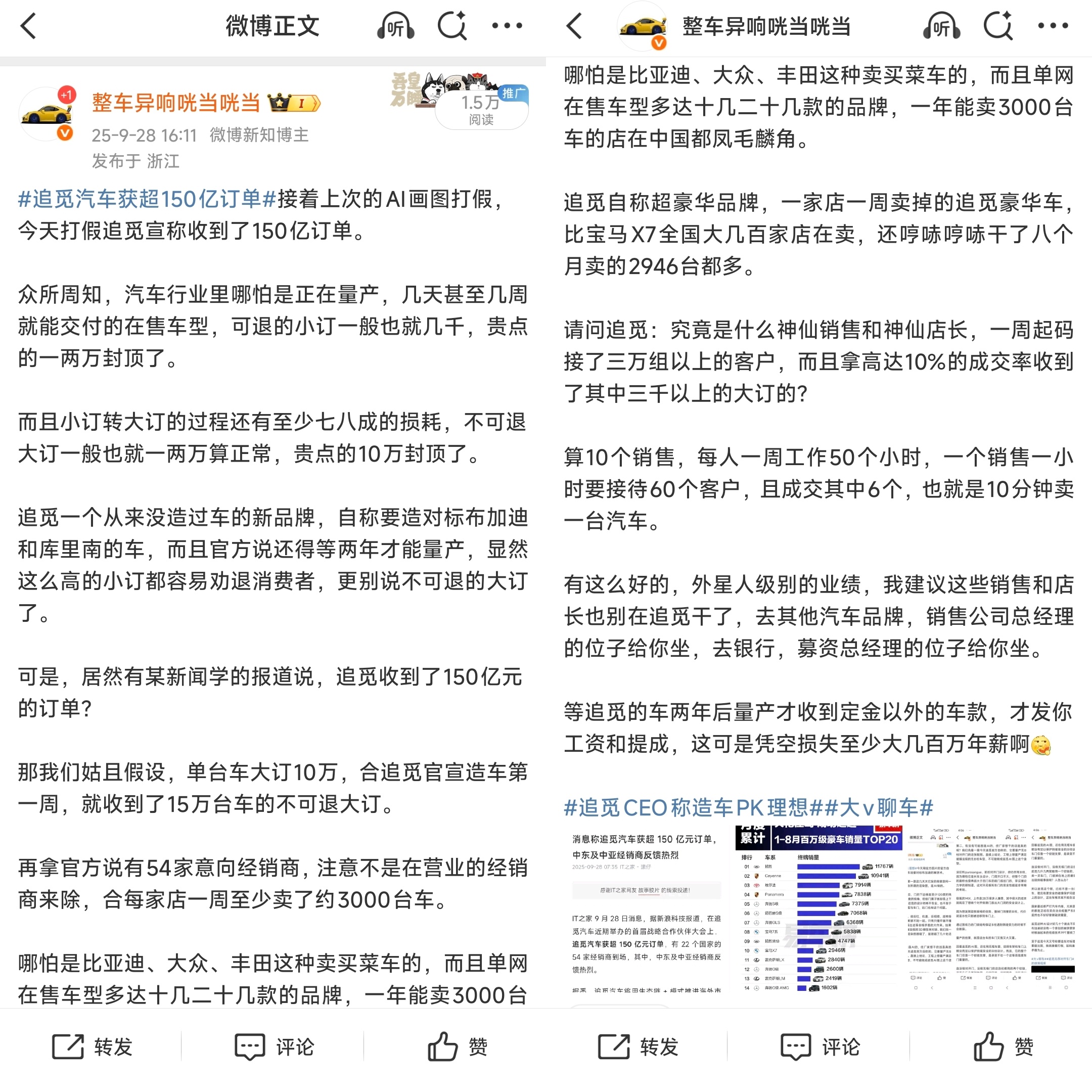 之前我在打假追觅造车的帖子详细算过,一个区区54家意向门店,还全部“营业”在国外的品牌,车价还百万级,且两年后交付,且订金起码10万级,且卖了15万台,才够凑出它吹的150亿的订单。