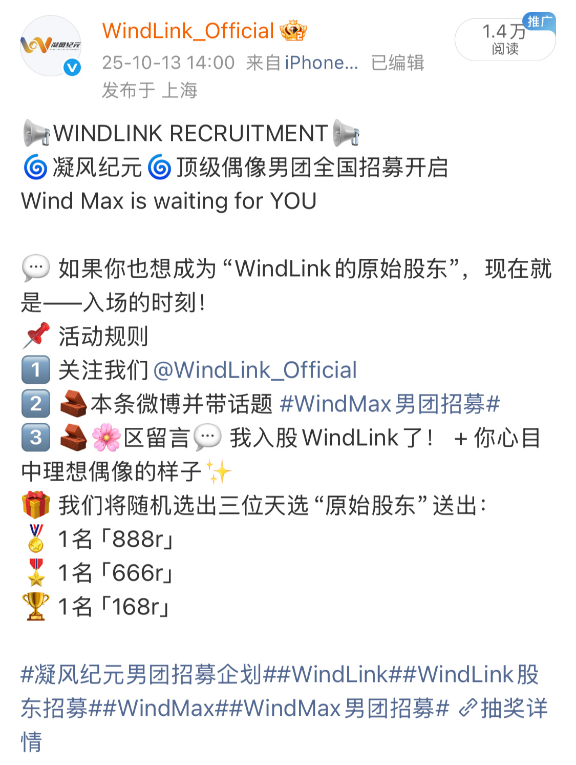 👑 全民股东请注意,男团新企划来了!…顶级男团企划+全民股东+高额奖池 WindMax男团招募 这波太会玩了💥 WindLink股东招募凝风纪元男团招募企划上新了内娱
