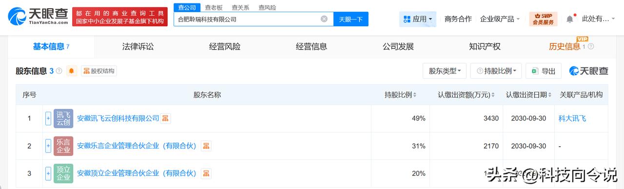 【科大讯飞等成立新科技公司注册资本7000万】 天眼查工商信息显示,近日,合肥