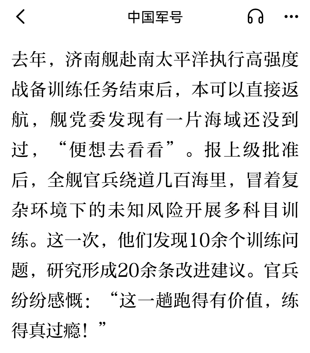 烽火问鼎计划去年,济南舰赴南太平洋执行高强度战备训练任务结束后,本可以直接返航,舰党委发现有一片海域还没到过,“便想去看看”。报上级批准后,全舰官兵绕道几百海里,冒着复杂环境下的未知风险开展多科目训练。这一次,他们发现10余个训练问题,研究形成20余条改进建议。