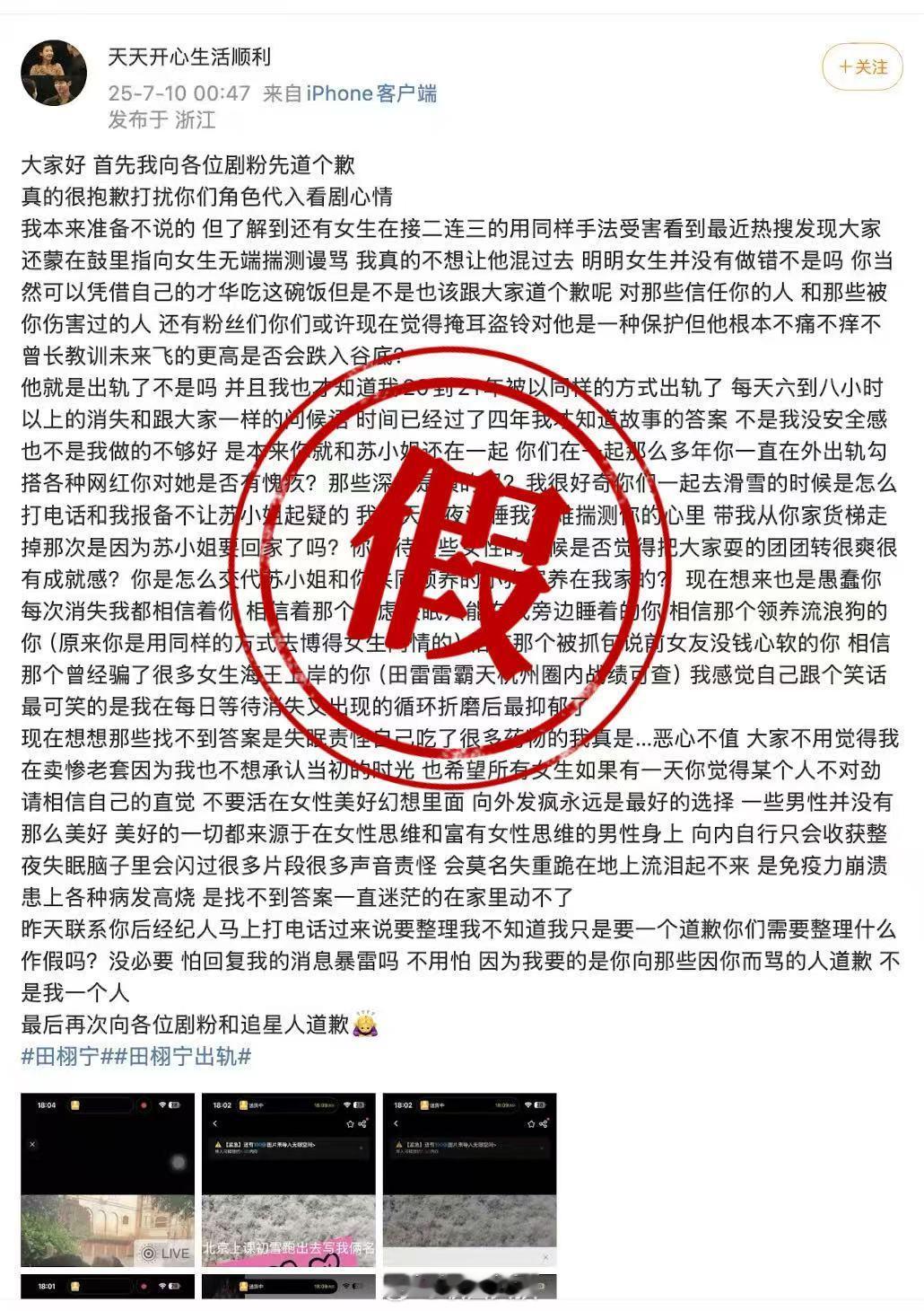 田栩宁工作室公布告黑进度了!!之前在各个平台造谣、伪造聊天记录、虚构恋情的“天天开心”,披露出用户信息竟然是男的!!从假图到假身份,一整套剧本式造谣,荒唐到离谱。此人一直持续不断的造谣,背后目的也是细思极恐了,田栩宁才是真的被做局了吧……下次刷到“爆料贴”,别急着信,戏太真反而假。